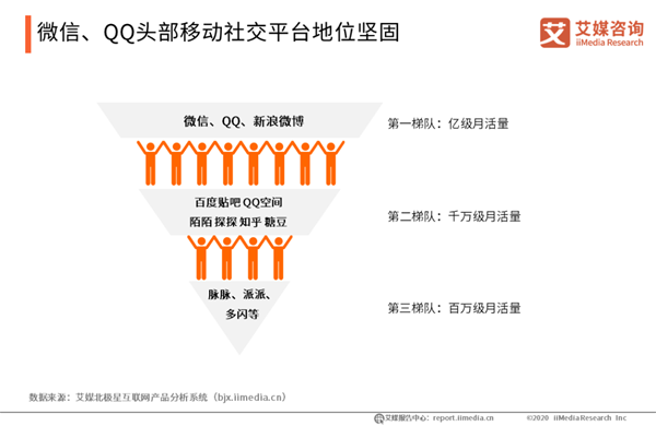 微信、QQ頭部移動(dòng)社交平臺(tái)地位堅(jiān)固 iiMedia Research(艾媒咨詢)數(shù)據(jù)顯示,在中國(guó)主流移動(dòng)社交平臺(tái)月均活躍用戶規(guī)模方面,競(jìng)爭(zhēng)格局趨于穩(wěn)定。微信、QQ、微博以億級(jí)月活量位居移動(dòng)社交行業(yè)第一梯隊(duì),而第二、第三梯隊(duì)月活量也分別達(dá)到千萬(wàn)級(jí)、百萬(wàn)級(jí)。微信、QQ頭部地位難以撼動(dòng), 2020年1月月活量分別達(dá)到10億、6.5億,而微博月活量也在3億左右。與此同時(shí),在內(nèi)容社區(qū)、陌生人社交等細(xì)分賽道上競(jìng)逐激烈。