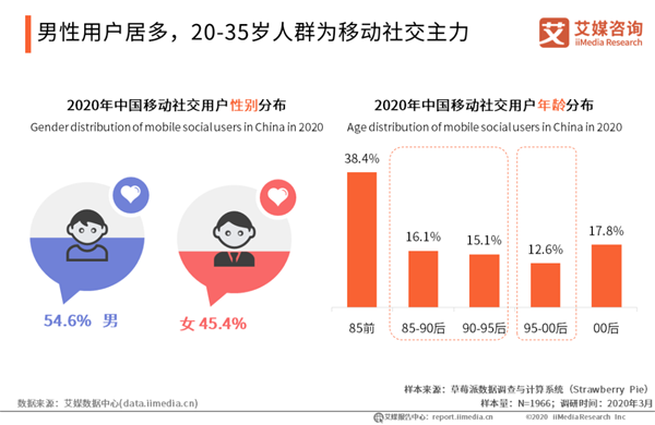 男性用戶居多,20-35歲人群為移動(dòng)社交主力 iiMedia Research(艾媒咨詢)調(diào)研數(shù)據(jù)顯示,超過(guò)半數(shù)的移動(dòng)社交用戶為男性,男性用戶占比為女性用戶兩倍左右;在年齡方面,85-95后占到31.2%,95-00后占到了12.6%,20-35歲人群占到43.8%。