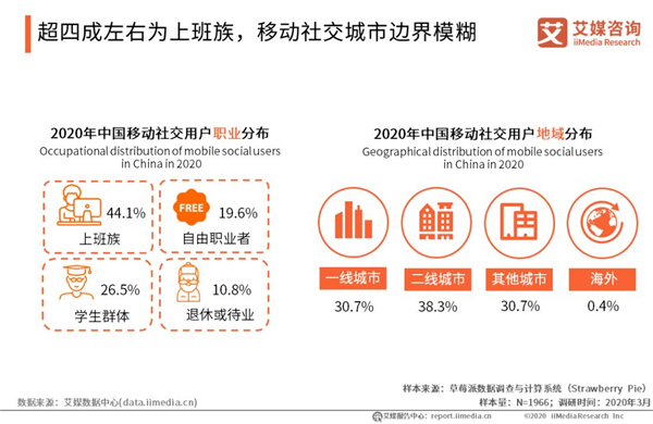 超四成左右為上班族,移動(dòng)社交城市邊界模糊 iiMedia Research(艾媒咨詢)調(diào)研數(shù)據(jù)顯示,超四成的受訪用戶為上班族,具有較為穩(wěn)定的工作,緊隨其后的分別是學(xué)生及自由職業(yè)者群體。在地域分布上,各線城市覆蓋用戶較均衡,也有個(gè)別為海外用戶,這在一定程度反映出移動(dòng)社交的邊界不再明顯,隨著移動(dòng)互聯(lián)網(wǎng)及設(shè)備的發(fā)展及社交需求的推動(dòng),移動(dòng)社交已滲透到下線城市,并構(gòu)成社會(huì)基礎(chǔ)的重要部分。