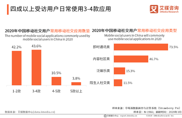 四成以上受訪用戶日常使用3-4款應(yīng)用 iiMedia Research(艾媒咨詢)調(diào)研數(shù)據(jù)顯示,在常用移動(dòng)社交應(yīng)用數(shù)量調(diào)研中,43.6%的受訪用戶日常使用3-4款應(yīng)用。而在常用移動(dòng)社交應(yīng)用類型方面,微信、QQ為代表的即時(shí)通訊類占到絕大比重。艾媒咨詢分析師認(rèn)為,當(dāng)前移動(dòng)社交用戶對(duì)社交有著較高需求,社交方式仍以熟人社交為主,隨著移動(dòng)社交頭部平臺(tái)的發(fā)展,移動(dòng)社交用戶更傾向于聚集在產(chǎn)品體系相對(duì)完善、用戶體量較大的頭部移動(dòng)社交平臺(tái)上。