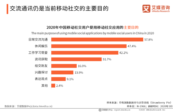 預(yù)計(jì)2020年中國(guó)移動(dòng)社交用戶規(guī)模突破9億人 iiMedia Research(艾媒咨詢)數(shù)據(jù)顯示,2019年中國(guó)移動(dòng)社交用戶規(guī)模達(dá)8.62億,預(yù)計(jì)到2020年用戶規(guī)模突破9億。艾媒咨詢分析師認(rèn)為,龐大的移動(dòng)社交用戶規(guī)模也意味著更多的市場(chǎng)可能性。