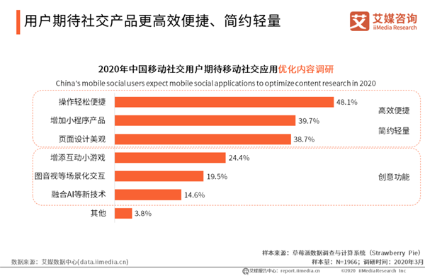 用戶期待社交產(chǎn)品更高效便捷、簡(jiǎn)約輕量 iiMedia Research(艾媒咨詢)調(diào)研數(shù)據(jù)顯示,近五成的受訪用戶期待移動(dòng)社交應(yīng)用在操作上進(jìn)一步優(yōu)化使用體驗(yàn),與此同時(shí),也有近四成的受訪用戶對(duì)小程序產(chǎn)品、產(chǎn)品頁(yè)面設(shè)計(jì)提出一定要求。艾媒咨詢分析師認(rèn)為,移動(dòng)社交用戶對(duì)操作便捷、小程序開(kāi)發(fā)及頁(yè)面設(shè)計(jì)美觀等有著普遍需求,這側(cè)面映射出當(dāng)前移動(dòng)社交用戶更青睞于高效便捷、簡(jiǎn)約輕量的社交產(chǎn)品。