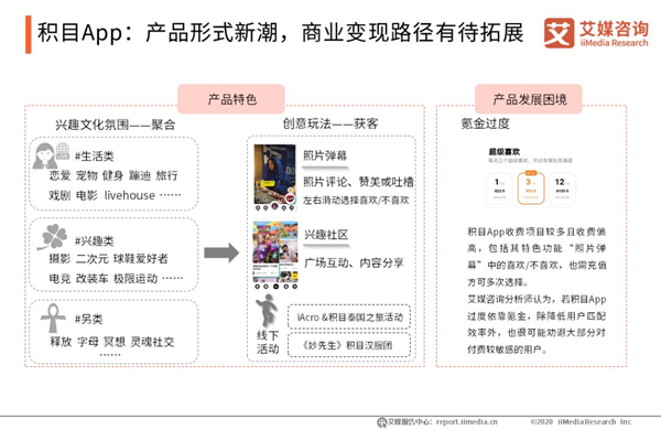 積目App:產(chǎn)品形式新潮,商業(yè)變現(xiàn)路徑有待拓展 積目App倡導(dǎo)以興趣為基礎(chǔ),服務(wù)于青年文化,為藝術(shù)、音樂(lè)、潮流、時(shí)尚等圈子搭建平臺(tái)。在興趣文化氛圍打造方面,積目產(chǎn)品形式較為新潮,同時(shí)納入主流、小眾愛(ài)好。此外,積目App還在線上社交的基礎(chǔ)上,為用戶提供線下社交場(chǎng)景。整體而言,積目具有較好的產(chǎn)品特色,但其商業(yè)變現(xiàn)路徑可行性仍有待進(jìn)一步驗(yàn)證。