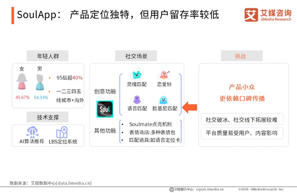 SoulApp:產(chǎn)品定位獨(dú)特,但用戶留存率較低 發(fā)布于2015年的SoulApp,是一款專門針對(duì)年輕人社交,通過(guò)AI算法匹配用戶的陌生人社交軟件。Soul定位獨(dú)特,Slogan“跟隨靈魂找到你”專注于年輕人“孤獨(dú)”的痛點(diǎn),借助AI算法實(shí)現(xiàn)“靈魂測(cè)試”,這也成為Soul較為突出的產(chǎn)品特色。但陌生人社交應(yīng)用普遍缺乏有效的溝通推進(jìn)方法,在社交破冰,社交線下拓展等方面都對(duì)產(chǎn)品提出了更高的要求。此外,陌生人社交平臺(tái)的質(zhì)量還容易受到用戶、內(nèi)容的影響,平臺(tái)后續(xù)發(fā)展仍面臨重重考驗(yàn)。