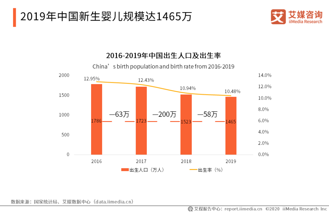 2019年中國新生嬰兒規(guī)模達(dá)1465萬 iiMedia Research(艾媒咨詢)數(shù)據(jù)顯示, 2019年中國新生嬰兒規(guī)模達(dá)到1465萬, 其中二孩及以上孩次的比例達(dá)到了59.5%,盡管2019年出生率為近年最低值,但仍保持在10%以上。此外,2019年新生嬰兒較上年減少58萬,與2018年減少200萬相較,新生嬰兒減少量有所下降。整體而言,全面二孩政策正在發(fā)揮著積極效用,未來中國新生嬰兒規(guī)模仍有較大增長潛力。