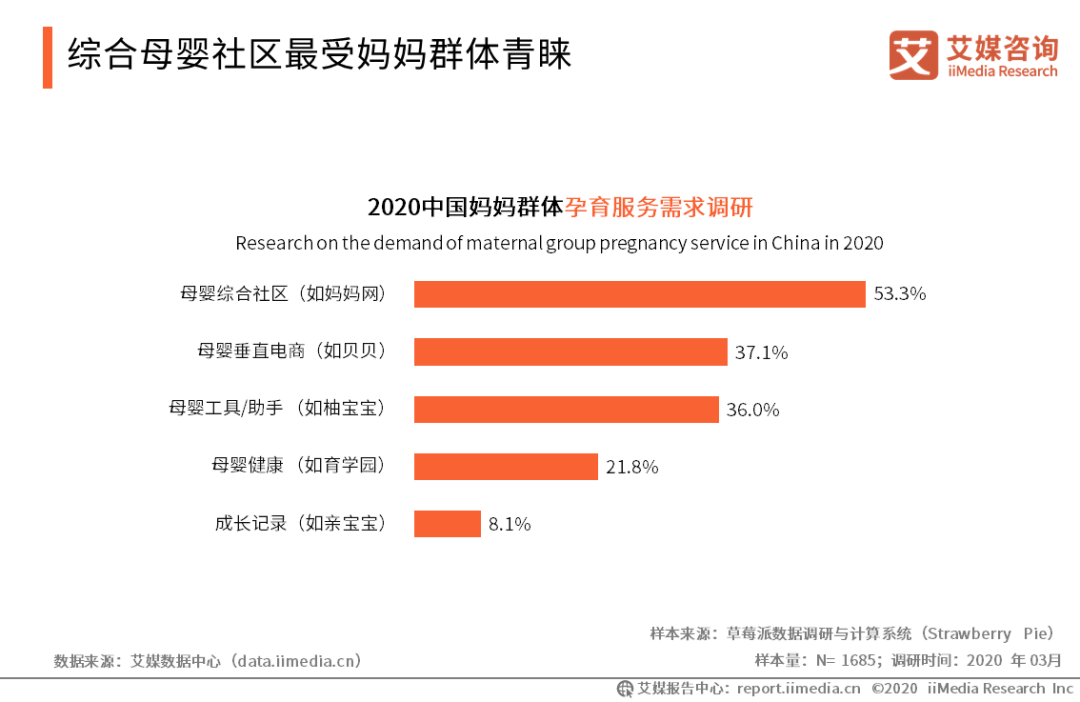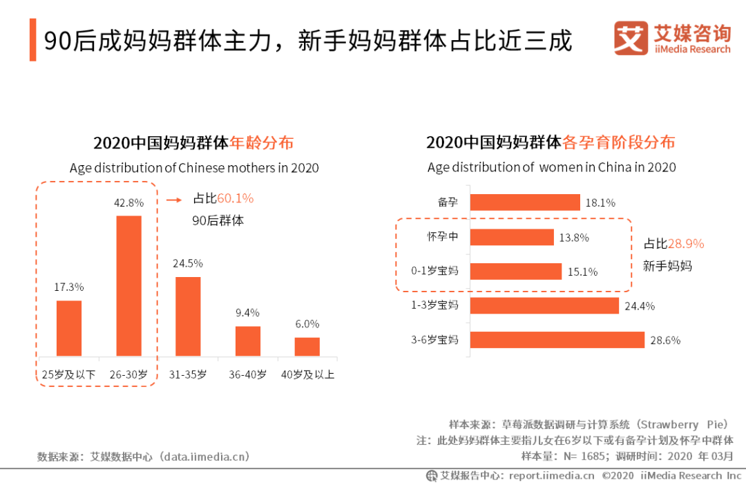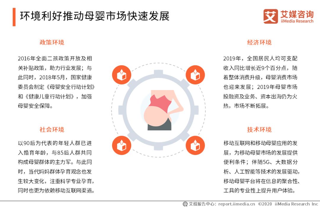 導(dǎo)讀 iiMedia Research(艾媒咨詢)數(shù)據(jù)顯示,預(yù)計2020年分娩的媽媽群體達(dá)到1530萬。隨著媽媽群體對產(chǎn)品和服務(wù)的需求逐漸提升,以媽媽群體為主導(dǎo)的母嬰市場加速發(fā)展,綜合母嬰平臺更具有競爭力。 報告核心觀點 二孩政策正發(fā)揮積極效用,2020年媽媽群體將達(dá)到1530萬 iiMedia Research(艾媒咨詢)數(shù)據(jù)顯示,2020年中國新生嬰兒規(guī)模達(dá)1465萬。在全面二孩政策驅(qū)動下,預(yù)計2020年分娩的媽媽群體達(dá)到1530萬。 媽媽是家庭育兒主力 父親孕育角色比重逐步提升 iiMedia Research(艾媒咨詢)數(shù)據(jù)顯示,在家庭育兒方面,媽媽群體是家庭育兒的主力,總占比近六成。另外,父親在家庭孕育中的角色擔(dān)當(dāng)也在逐步提升。孕育觀點上,一線城市媽媽群體以孩子為中心的觀念更為明顯。艾媒咨詢分析師認(rèn)為,媽媽仍是當(dāng)前家庭育兒的主體,另外基于一線城市的職業(yè)競爭壓力,祖輩在家庭育兒中的角色更為重要。 母嬰綜合社區(qū)最受媽媽青睞,專業(yè)性需求提升 iiMedia Research(艾媒咨詢)數(shù)據(jù)顯示,媽媽群體對產(chǎn)品和服務(wù)的需求逐漸提升,單一運營模式的母嬰平臺已無法滿足媽媽多元化需求。艾媒咨詢分析師認(rèn)為,移動母嬰平臺,尤其是母嬰綜合社區(qū),擁有海量專業(yè)孕育知識,并為媽媽群體提供交流互動平臺,更易受到媽媽群體的青睞。 以下為報告節(jié)選內(nèi)容 環(huán)境利好推動母嬰市場快速發(fā)展