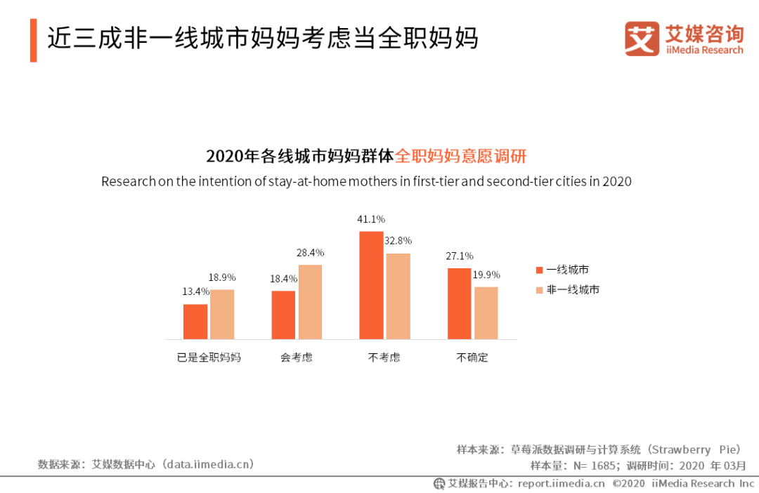 近三成非一線城市媽媽考慮當(dāng)全職媽媽 iiMedia Research(艾媒咨詢)數(shù)據(jù)顯示,在全職媽媽問題上,一線城市媽媽群體明確表示不考慮當(dāng)全職媽媽的占比為41.1%。近三成的非一線城市的媽媽人群則表示會考慮全職媽媽。艾媒咨詢分析師認(rèn)為,整體而言一線城市媽媽群體趨向于更加關(guān)注自身職業(yè)發(fā)展,而非一線城市的媽媽群體在職業(yè)規(guī)劃上則有更大的自由度。