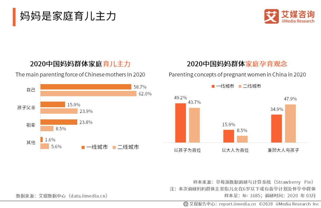 媽媽是家庭育兒主力 iiMedia Research(艾媒咨詢)數(shù)據(jù)顯示,在家庭育兒方面,媽媽群體是家庭育兒的主力。另外,父親在家庭孕育中的角色擔(dān)當(dāng)也在逐步提升。孕育觀點上,一線城市媽媽群體以孩子為中心的觀念更為明顯。艾媒咨詢分析師認(rèn)為,媽媽仍是當(dāng)前家庭育兒的主體,另外基于一線城市的職業(yè)競爭壓力,祖輩在家庭育兒中的角色更為重要。