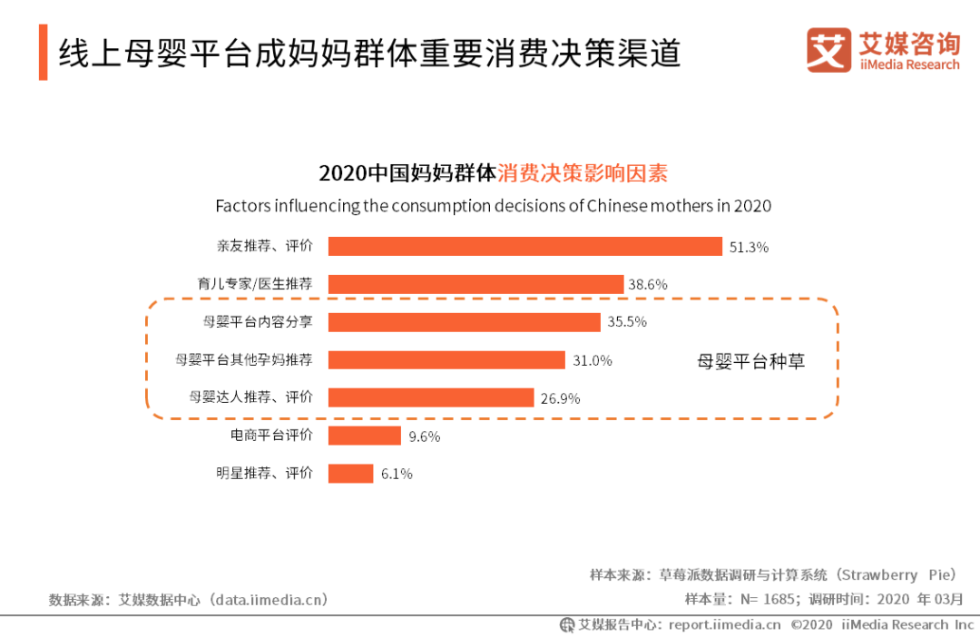 線上母嬰平臺成媽媽群體重要消費決策渠道 iiMedia Research(艾媒咨詢)數(shù)據(jù)顯示,在母嬰產(chǎn)品消費決策的影響因素調(diào)研中,媽媽群體更信賴親友、專家及母嬰平臺內(nèi)容。與此同時,當(dāng)代媽媽群體消費決策行為主要圍繞母嬰平臺進(jìn)行,受母嬰平臺內(nèi)的其他媽媽及KOL推薦種草的比例基本在三成左右。艾媒咨詢分析師認(rèn)為,除了親友推薦,線上母嬰平臺內(nèi)容已成為媽媽群體決策的重要影響因素。