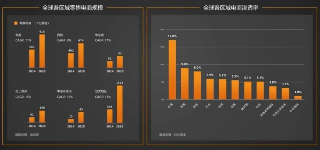 全球各區(qū)域電商增速高、滲透率低,發(fā)展空間廣闊 從全球各區(qū)域零售電商的平均年復合增長率(CAGR)來看,各區(qū)域的零售電商增速都比較高,其中,中東&非洲地區(qū)CAGR最高,達19%,而亞太地區(qū)達18%。從電商滲透率來看,除中國外,其他國家和地區(qū)的電商滲透率都比較低,對中國的玩具和嬰童用品企業(yè)來說,跨境電商有廣闊的發(fā)展空間。