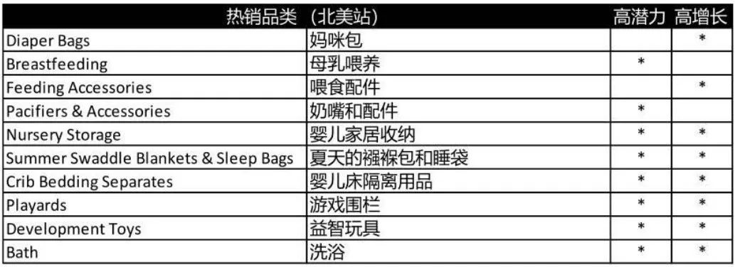嬰童用品:成交額連續(xù)三年高速增長,嬰兒家居類可重點關注 亞馬遜美國嬰童類成交額連續(xù)三年高速增長,其中嬰兒床、喂養(yǎng)類、安全類是增長較快的三個品類,熱銷產(chǎn)品包括媽咪包、喂養(yǎng)類、奶嘴和牙咬玩具、嬰兒家居類等,其中嬰兒家居類如游戲圍欄、收納類、家居用品等在亞馬遜美國站點比較暢銷。 北美站熱銷品類: