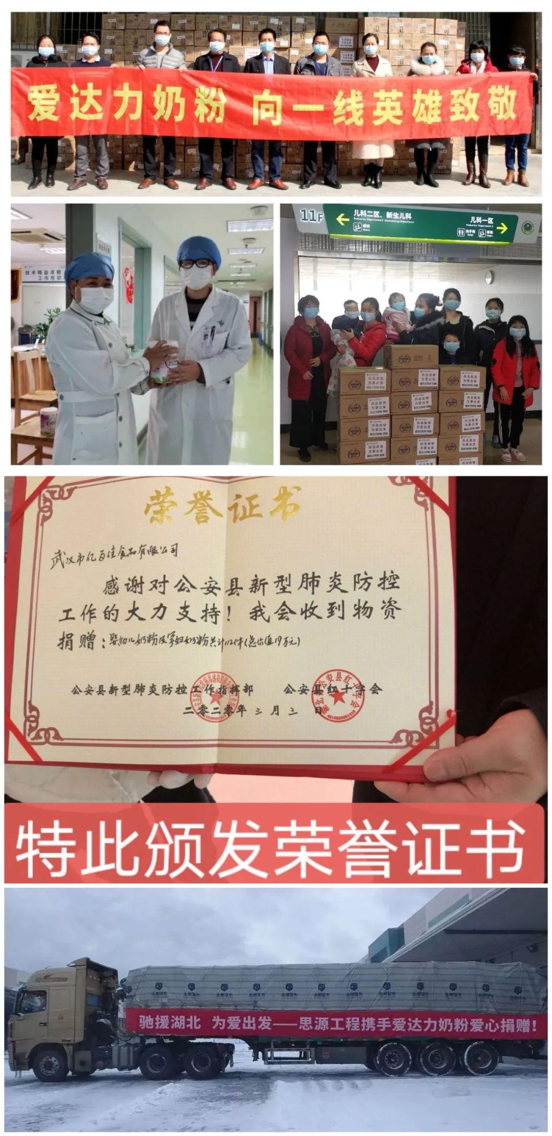 廣東億百公司,積極響應(yīng)號召,疫情期間先后向湖北恩施福利院捐贈維愛佳奶粉1021罐,向湖北荊州慈善總會捐贈愛達(dá)力奶粉1356罐,向湖北公安縣紅十字會共計(jì)捐贈愛達(dá)力奶粉998罐,三批累計(jì)捐贈物資120多萬元。同時,向支援廣東、廣西、武漢、湖北黃岡、湖北隨州等多個地區(qū),涉及醫(yī)院、學(xué)校、幼兒園及社區(qū)等多家機(jī)構(gòu),捐贈愛心物資超1500萬元。以及向武漢雷神山醫(yī)院,湖北省婦幼保健院,西安國際醫(yī)學(xué)中心醫(yī)院武漢醫(yī)療隊(duì)愛心捐贈營養(yǎng)配方奶粉、紐貝樂品牌乳鐵蛋白、口罩等物資,總價值達(dá)200萬元。