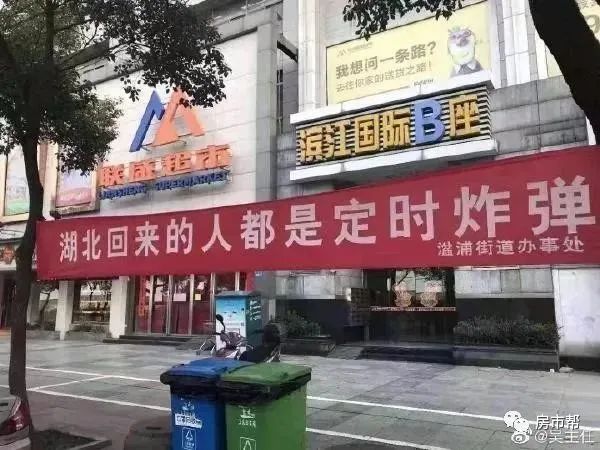 2月4日,江西湓浦街道辦事處拉起巨大橫幅。打出了“湖北回來的人都是定時炸彈”。
