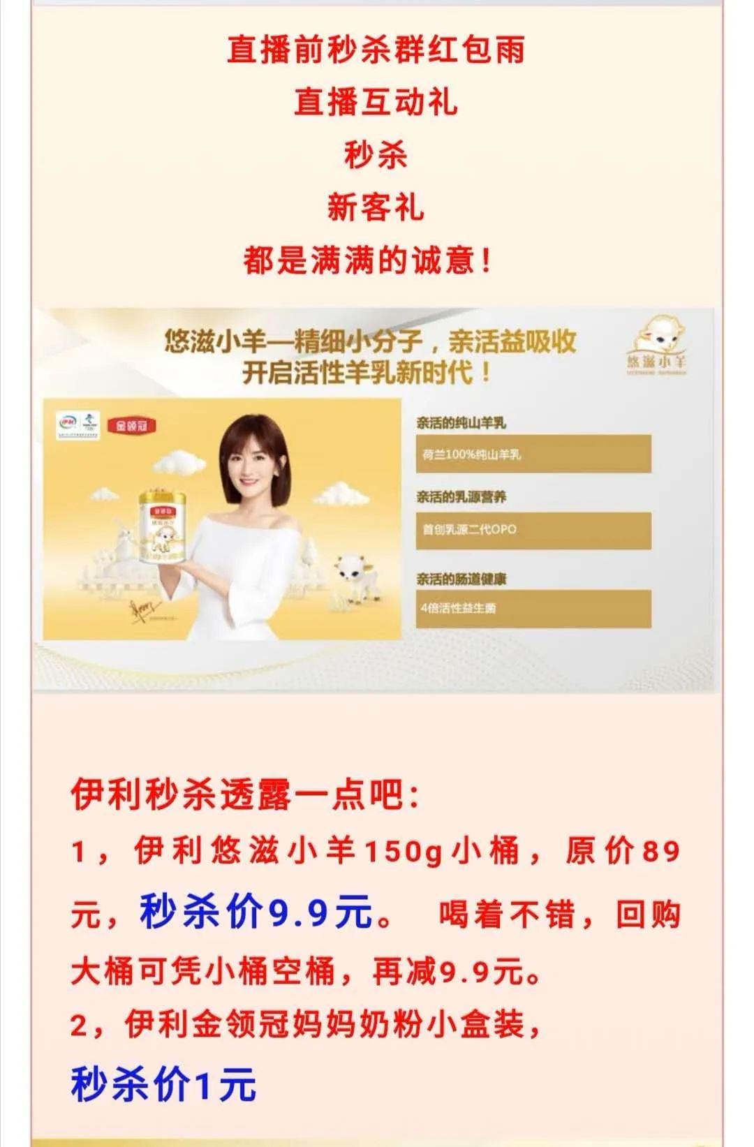 這位母嬰店老板透露,進(jìn)入直播間的顧客都是奔著紅包去的,一場直播中有一個(gè)頗令人動心的環(huán)節(jié)是“紅包雨”,紅包金額不大,2~3毛錢的數(shù)額雖然小,也能引得人們“瘋狂”涌入直播間,有的人甚至在朋友圈“呼朋喚友”,邀相熟的、不熟的進(jìn)入直播間來一同搶紅包,在某場直播中,一位用戶邀請人數(shù)最高達(dá)358人。 “沒有紅包了,直播間的人氣就會掉的很快。”奔著紅包禮品來的人氣,盡管能上千破萬,但真正下單的有效客戶卻屈指可數(shù),這讓已經(jīng)開展了幾次的母嬰店老板無奈地表示“都是假人氣”。 “拼價(jià)格” 筆者也關(guān)注過幾次直播活動,注意到這類活動最大的“噱頭”便是各種低價(jià)秒殺的優(yōu)惠活動,如在一場直播活動的預(yù)告中,伊利一款羊奶粉新品悠滋小羊在門店直播中有秒殺活動,“原價(jià)89元的150g小桶悠滋小羊秒殺價(jià)9.9元,金領(lǐng)冠媽媽奶粉秒殺價(jià)1元。”