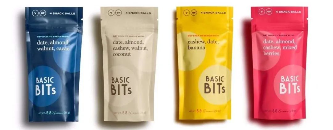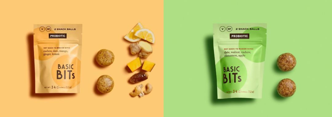 圖片來源:Basic Bits官網(wǎng) 廣告公司還為品牌拍攝了一組高度程式化的彩色照片,進一步強調(diào)了視覺概念。包裝標(biāo)識清晰明了,忠于品牌使命,用有序的,不緊不慢的態(tài)度準(zhǔn)確的告訴你每個包裝里有些什么。 在顏色的選擇上,用基礎(chǔ)調(diào)色盤中的顏色進一步加強了品牌返璞歸真到基礎(chǔ)成分的理念。該品牌的益生菌零食系列還衍生引入了一個二級調(diào)色板,大膽的顏色和簡單的關(guān)鍵信息快速抓住消費者注意力。