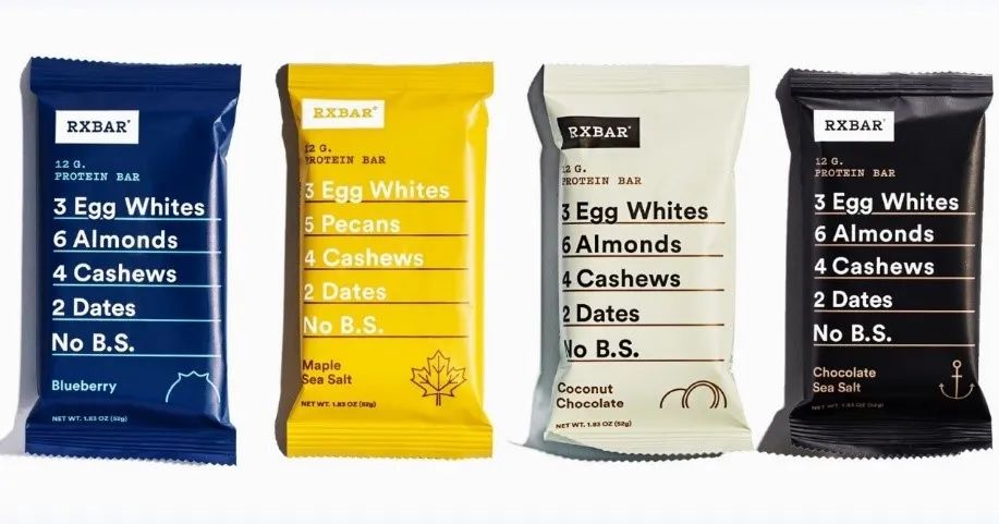 圖片來源:農(nóng)夫山泉天貓旗艦店 其包裝設(shè)計完美體現(xiàn)了“高精科研感”,通身透明,沒有過多著色和廣告語,只有最顯眼的鋰水兩個大字和成分介紹的小字,會讓消費者產(chǎn)生“實驗室里貼著標(biāo)簽的瓶子”這一最直觀的關(guān)于高科技的聯(lián)想。 4、清潔標(biāo)簽:越簡單越好,告別花里胡哨的廣告語 清潔標(biāo)簽這個詞這兩年在食品包裝界幾乎成為了最火的詞之一,據(jù)全球領(lǐng)先的市場調(diào)研機構(gòu)Research and Markets數(shù)據(jù),2023年全球清潔標(biāo)簽市場將達(dá)475億美元,年復(fù)合增長率為6.8%[8]。 “清潔標(biāo)簽”源于歐盟的一種主張,即在食品標(biāo)簽中,盡可能少出現(xiàn)E編碼(食品添加劑),最大可能保持食品的天然屬性。清潔標(biāo)簽的出現(xiàn),其根本源頭在于消費者對天然、健康的追求。 根據(jù)2018年L.E.K.的一項調(diào)查稱,超過60%的消費者會選擇標(biāo)簽上寫著“不含人工成分”、“不含防腐劑”和“純天然”的產(chǎn)品。2018年的Innova市場報告稱,91%的美國消費者認(rèn)為含有可識別成分的食品和飲料選擇更健康。 消費者購買功能性食品的心態(tài),和購買奶粉、寵物食品、兒童食品時的心態(tài)非常相似,在關(guān)注次序上,首要關(guān)注的都是營養(yǎng)成分和配方。其次才是口感和品牌風(fēng)格。 了解了消費者這一價值排序后,在包裝設(shè)計上直接把功效和成分列出來代替廣告語的方式被越來越多的食品品牌采用。 隨著消費者認(rèn)知的升級,越來越多的消費者也能理解這些成分的名稱和其代表的功效。在做出購買決定時,“成分”成為比品牌力和產(chǎn)品描述更重要的決定因素。 RXBAR創(chuàng)立于2013年,是一個生產(chǎn)能量棒的美國品牌,在2015 年營收只有650萬美元,通過改變其包裝,2017年營收增長到1.3億美元的品牌[9]。