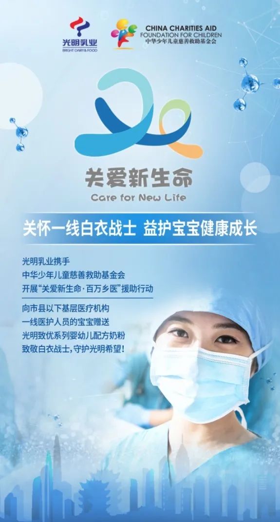 在“百萬鄉(xiāng)醫(yī)”援助行動(dòng)中,光明乳業(yè)攜手中華少年兒童慈善救助基金會(huì),關(guān)懷一線醫(yī)護(hù)人員,向山東、河南、浙江等市縣以下基層醫(yī)療衛(wèi)生機(jī)構(gòu)(人民醫(yī)院、中醫(yī)院、婦幼保健院、疾控中心、鄉(xiāng)鎮(zhèn)衛(wèi)生院、社區(qū)衛(wèi)生服務(wù)中心等)醫(yī)護(hù)人員中有0-3歲嬰幼兒的家庭,捐贈(zèng)20202罐價(jià)值300余萬元的光明致優(yōu)系列嬰幼兒配方奶粉,保障一線醫(yī)護(hù)人員家中寶寶口糧的供應(yīng),守住美麗勇敢白衣戰(zhàn)士們背后的家人。