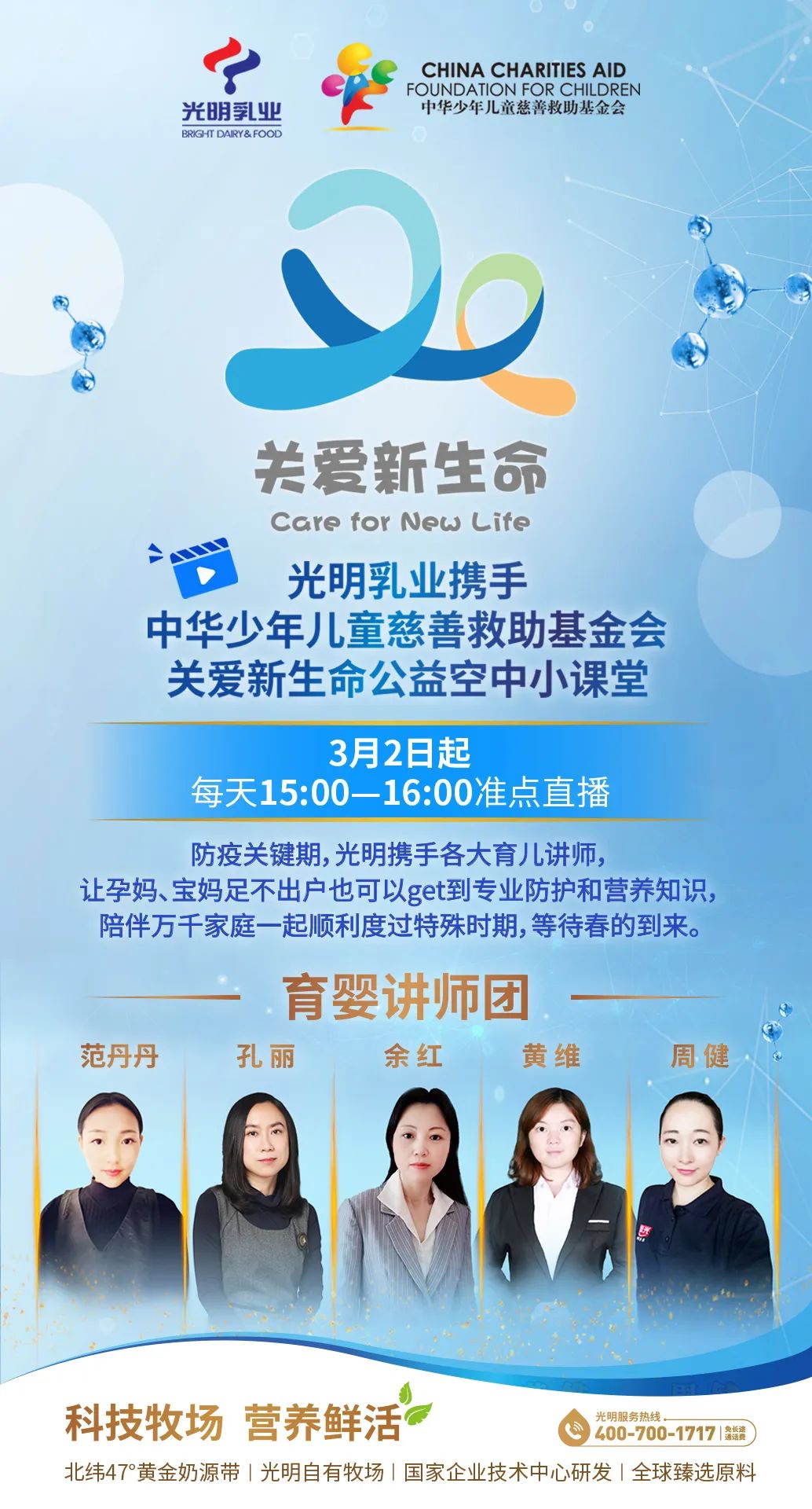 除了捐贈(zèng)奶粉之外,光明乳業(yè)育嬰講師團(tuán)隊(duì)與中華少年兒童慈善救助基金會(huì)聯(lián)合開展公益空中小課堂,將“關(guān)愛新生命”活動(dòng)推廣至線上。通過育兒課程直播,為孕媽、寶媽寶爸們帶來足不出戶的育兒支持與服務(wù),陪伴萬千家庭一起順利度過特殊時(shí)期,用專業(yè)育兒知識(shí)呵護(hù)祖國(guó)的花朵。