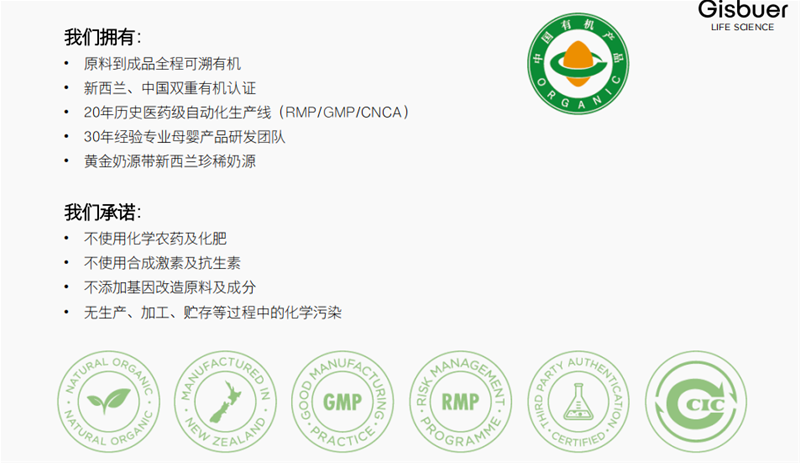 Gisbuer有機(jī)乳糖酶益生菌調(diào)制乳粉從原料到成品全程都可溯有機(jī)。有著新西蘭、中國(guó)等各國(guó)的雙重有機(jī)認(rèn)證。30年經(jīng)驗(yàn)的母嬰產(chǎn)品研發(fā)團(tuán)隊(duì)更加專業(yè),20年歷史醫(yī)藥級(jí)自動(dòng)化生產(chǎn)線更加可靠。并有包括HACCP(新西蘭初級(jí)產(chǎn)業(yè)部MPI認(rèn)證 Codex Alimentarius), CNAS(中國(guó)國(guó)家認(rèn)證認(rèn)可監(jiān)督管理委員會(huì)認(rèn)證的嬰幼兒配方奶粉生產(chǎn)廠商Certified Infant Formula Manufacturer for China) GMP(新西蘭藥物與醫(yī)療器械安全局 NZ Medicines & Medical Devices Safety Authority) MPI(風(fēng)險(xiǎn)管理與海外出口(奶制品)認(rèn)證 Risk Management & Export (Dairy) – 新西蘭初級(jí)產(chǎn)業(yè)部)等6大限全球公認(rèn)的檢驗(yàn)機(jī)構(gòu)檢測(cè)。 甄選自全世界僅存1%有機(jī)認(rèn)證奶源帶的新西蘭。值得消費(fèi)者放心信賴。