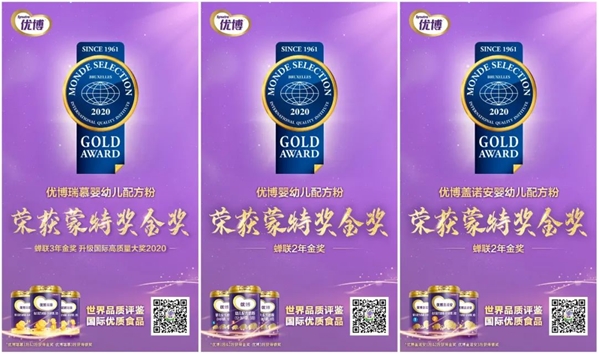 目前,在國家的監(jiān)管和扶持下,中國奶粉品牌不斷在奶源端、牧場端精耕細作,夯實中國奶業(yè)品質基礎,助力奶粉質量達到世界水平。越來越多的中國奶粉品牌逐漸走出國門,亮相世界,獲得滿堂喝彩! 2020年4月,優(yōu)博再一次吸引了全球奶粉市場的目光。2020年世界食品品質評鑒大會獎項正式公布,優(yōu)博旗下16款產(chǎn)品榮獲6項金獎、8項銀獎、2項銅獎。優(yōu)博瑞慕更是繼2018年評選后三次蟬聯(lián)蒙特獎金獎,并一舉將“國際高質量大獎2020”收入囊中!