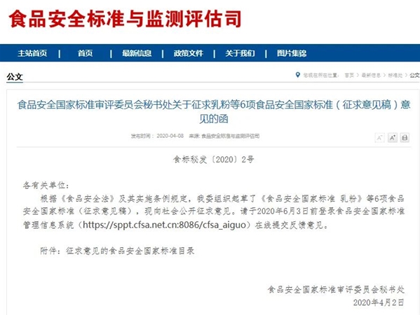 近日,根據(jù)《食品安全法》及其實(shí)施條例規(guī)定,國(guó)家衛(wèi)健委組織起草了《食品安全國(guó)家標(biāo)準(zhǔn)乳粉》等6項(xiàng)食品安全國(guó)家標(biāo)準(zhǔn)(征求意見(jiàn)稿),已面向社會(huì)公開(kāi)征求意見(jiàn)。