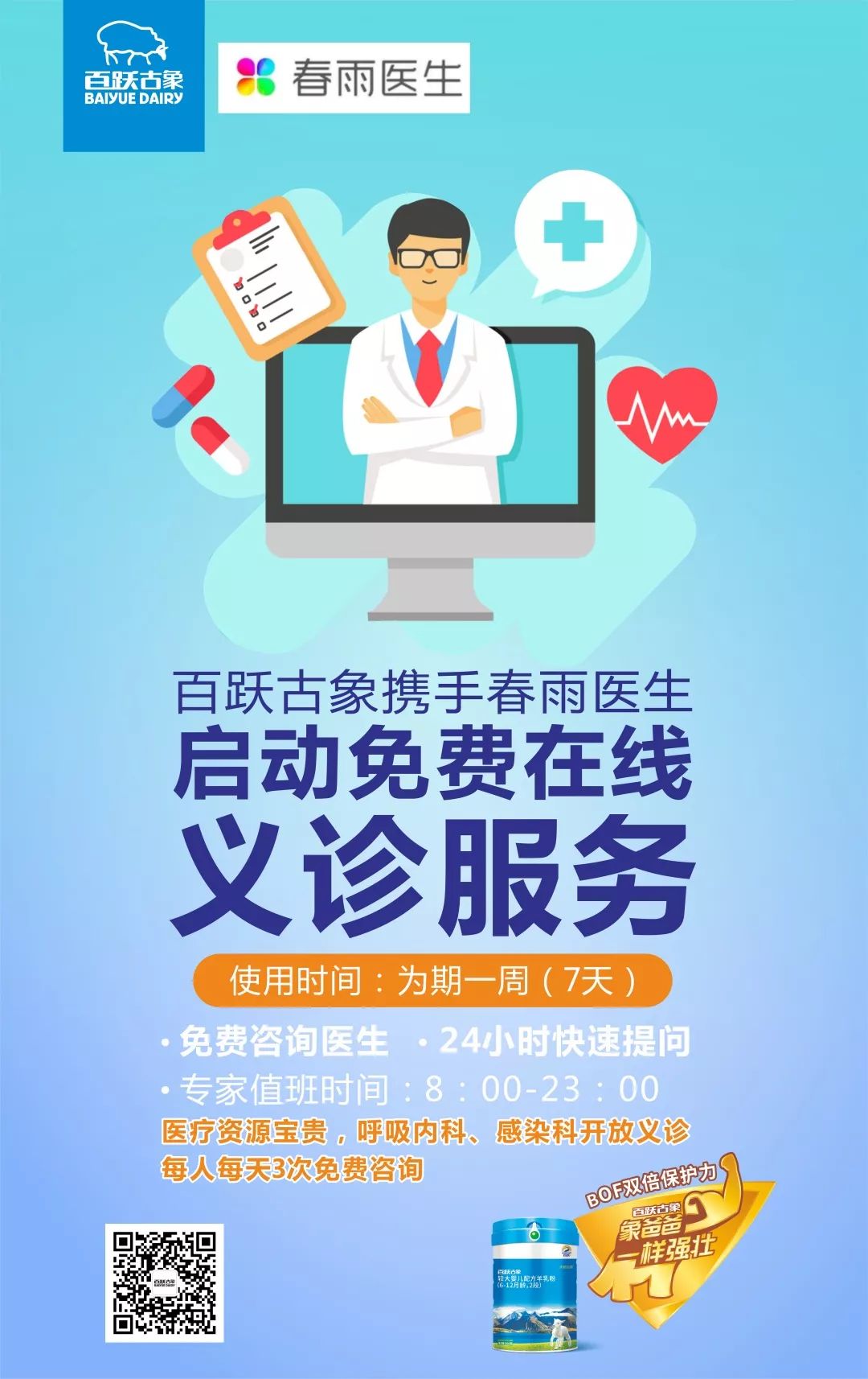 據(jù)悉,“譜恩在線醫(yī)生咨詢平臺(tái)”有2.1萬名專業(yè)醫(yī)生24小時(shí)全天侯響應(yīng),由“免費(fèi)問醫(yī)生”、“明星醫(yī)生”、“心理咨詢”三個(gè)功能組成。目前的核心功能就是“免費(fèi)問醫(yī)生”,消費(fèi)者可以在線咨詢關(guān)于兒科和婦產(chǎn)科的相關(guān)問題,并且是1對(duì)1的專屬人性化服務(wù)來為消費(fèi)者解決育兒困惑、普通疾病等相關(guān)問題,而消費(fèi)者只需要關(guān)注“譜恩綿羊媽媽”微信公眾號(hào)就能立即使用。 呵護(hù)健康,春雨醫(yī)生免費(fèi)義診 筆者了解到,今年譜恩開始實(shí)行譜恩和古象的雙品牌戰(zhàn)略,全面發(fā)力羊奶粉市場,實(shí)現(xiàn)新突破。為了更好的為消費(fèi)者創(chuàng)造價(jià)值,滿足消費(fèi)者需求,除了“譜恩在線醫(yī)生咨詢平臺(tái)”,譜恩和古象還聯(lián)合春雨醫(yī)生開展7天免費(fèi)義診活動(dòng),充分發(fā)揮醫(yī)生的專業(yè)優(yōu)勢來為消費(fèi)者排解壓力。