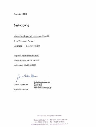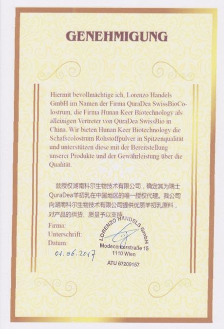 羊初乳中國(guó)獨(dú)家總代理證書(左)