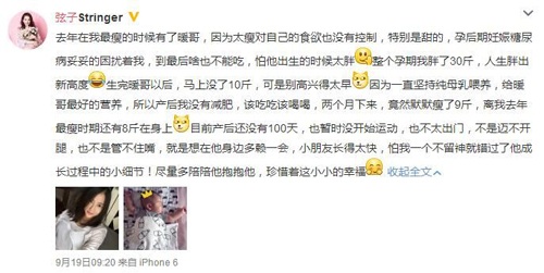 明星弦子在微博發(fā)表長文講述自己從懷孕到產(chǎn)后一路的體重變化。弦子稱自己在最瘦的時候有了寶寶,但是沒有控制好對甜食的喜愛,被孕后期的妊娠糖尿病所困擾。在懷孕期間胖了近30斤,生產(chǎn)后因堅持為兒子“暖哥”喂養(yǎng)母乳,一直也沒能瘦身,但卻默默瘦了9斤。目前產(chǎn)后還沒有100天,想要多陪陪兒子,還沒開始出門運動!