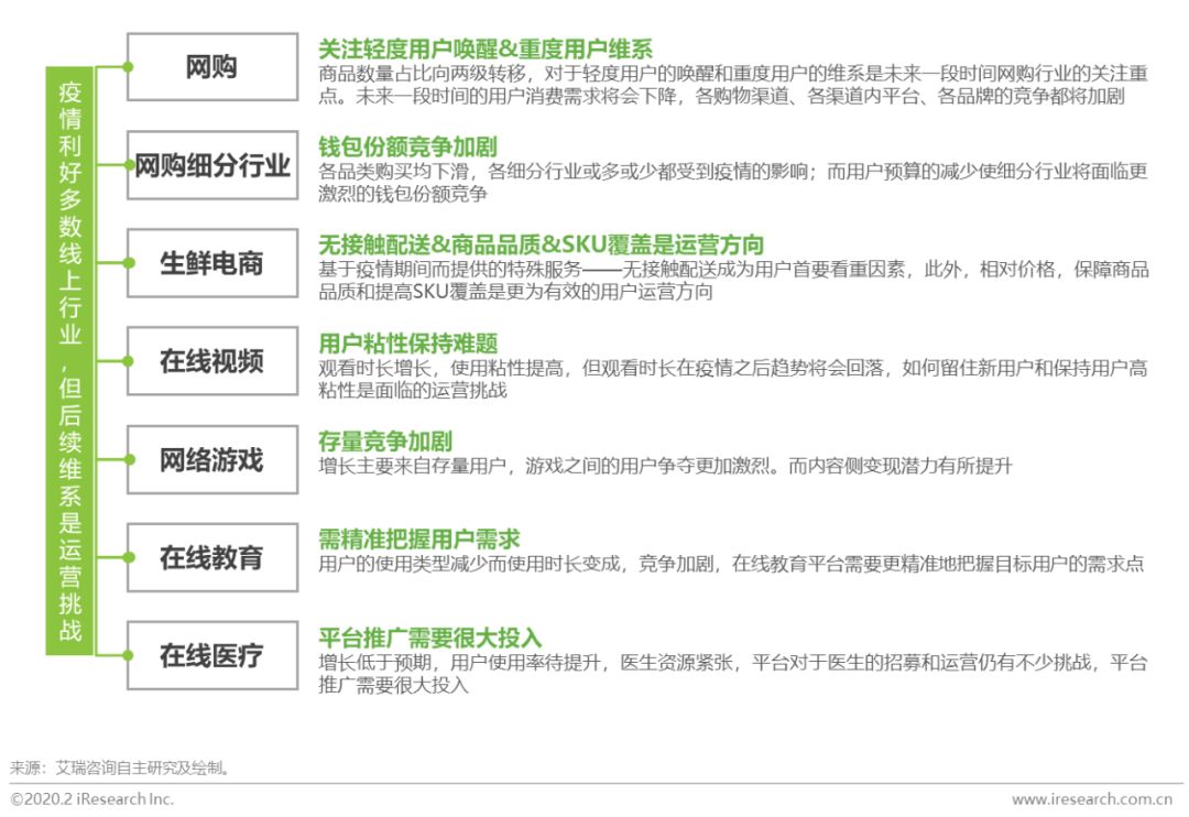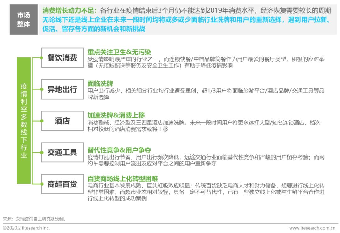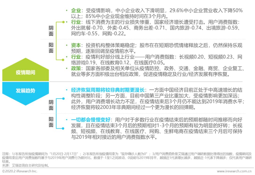 從調(diào)研結(jié)果來看,疫情期間線下消費(fèi)指數(shù)低迷,國(guó)內(nèi)旅游消費(fèi)指數(shù)-0.74,商務(wù)出差消費(fèi)指數(shù)-0.71,外出就餐消費(fèi)指數(shù)-0.70,是下滑最明顯的三個(gè)行業(yè);網(wǎng)約車用戶流出率近八成。視頻、游戲、在線教育等行業(yè)雖然短期爆發(fā),但增長(zhǎng)主要來自存量用戶,且面臨留住新用戶和保持用戶高粘性的運(yùn)營(yíng)挑戰(zhàn)。而疫情后用戶消費(fèi)增長(zhǎng)動(dòng)力不足,在疫情結(jié)束后3個(gè)月仍不能達(dá)到2019年消費(fèi)水平。在此期間,無論線下還是線上企業(yè)在未來一段時(shí)間均將或多或少面臨行業(yè)洗牌和用戶的品牌重新選擇,遇到用戶拉新、促活、留存各方面的新機(jī)會(huì)和新挑戰(zhàn)。艾瑞建議廣大企業(yè)及時(shí)把握消費(fèi)者趨勢(shì),在核心客戶守衛(wèi)、新用戶搶奪,以及存量用戶深度服務(wù)和產(chǎn)品創(chuàng)新方面有所應(yīng)對(duì),贏得這場(chǎng)疫情帶來的特殊排位戰(zhàn)。 報(bào)告摘要-堪嗟萬物陰陽內(nèi)