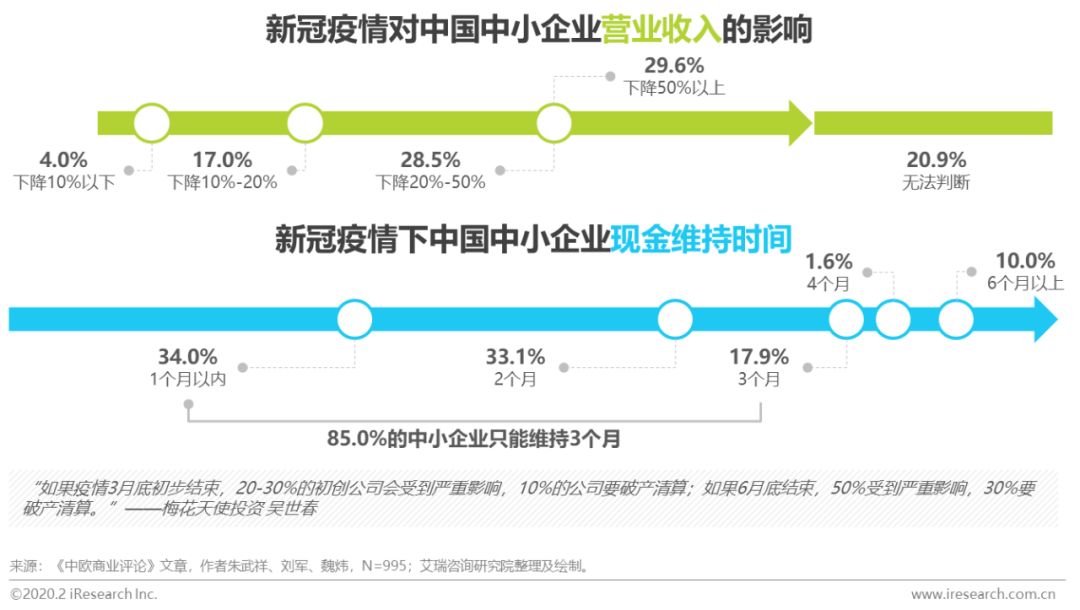 宏觀概覽 企業(yè)-覆巢之下,焉有完卵? 疫情顯著影響收入,85%中小企業(yè)現(xiàn)金維持時(shí)間在3個(gè)月內(nèi) 疫情防控要求下,企業(yè)復(fù)產(chǎn)復(fù)工推遲,使得大量中小企業(yè)收入下降(三成中小企業(yè)下降50%以上),現(xiàn)金流枯竭(85.0%的中小企業(yè)只能維持3個(gè)月)。嚴(yán)峻的經(jīng)濟(jì)環(huán)境下,國(guó)家和社會(huì)各界一方面要關(guān)注企業(yè)的債務(wù)危機(jī),積極采取應(yīng)對(duì)手段;另一方面也要關(guān)注企業(yè)為了轉(zhuǎn)移成本壓力而采取的降薪、裁員等手段帶來的社會(huì)性連鎖反應(yīng),穩(wěn)定民生。