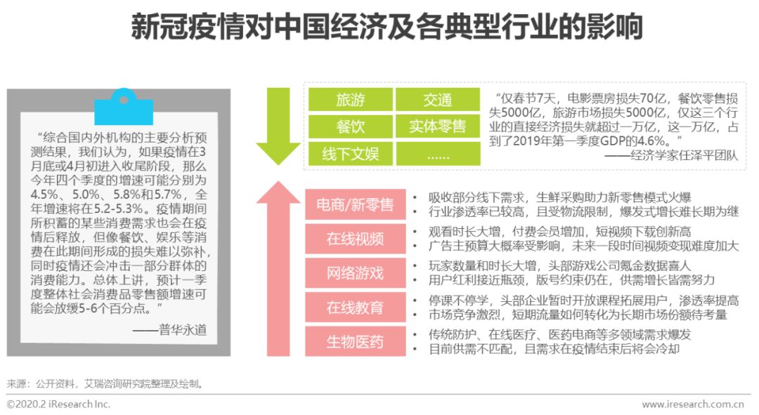 行業(yè)-偶有人笑,多聞人哭 疫情利空線下,利好線上 疫情防控要求下,居民外出消費(fèi)驟減,部分行業(yè)受國(guó)家要求暫停營(yíng)業(yè),旅游、餐飲、線下文娛(電影/演出賽事/展覽等)等線下消費(fèi)場(chǎng)景,尤其是聚集性消費(fèi)場(chǎng)景為主的行業(yè)遭重創(chuàng);家庭消費(fèi)場(chǎng)景及線上消費(fèi)成為主要消費(fèi)場(chǎng)景,電商/新零售、在線視頻、網(wǎng)絡(luò)游戲、在線教育、生物醫(yī)藥等逆勢(shì)上揚(yáng),迎來一波短期爆發(fā)式增長(zhǎng)。 整體上,國(guó)家經(jīng)濟(jì)增長(zhǎng)遭受打擊,全年GDP將在6%以下。一方面,中國(guó)經(jīng)濟(jì)目前正處于中高速增長(zhǎng)的結(jié)構(gòu)性調(diào)整階段;另一方面,目前中國(guó)第三產(chǎn)業(yè)比重加大,受疫情影響更加深遠(yuǎn),經(jīng)濟(jì)恢復(fù)將較2003年非典期間經(jīng)過一個(gè)更為漫長(zhǎng)的回彈期。