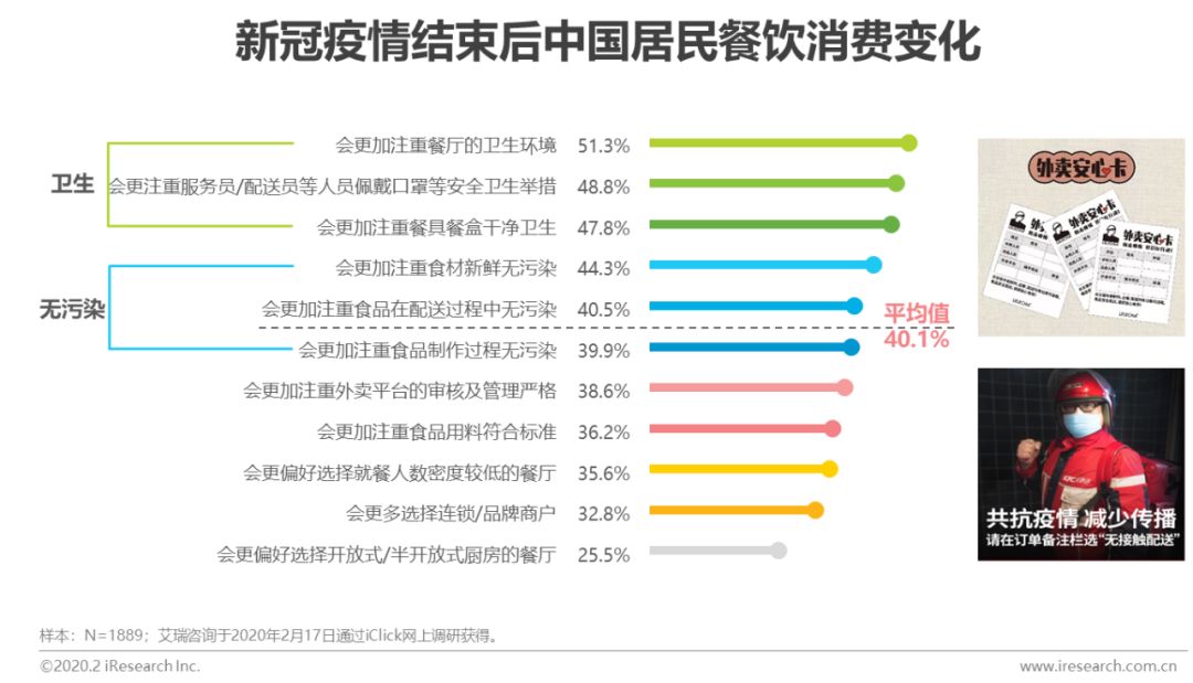 疫情結(jié)束后餐飲消費(fèi)變化 疫情結(jié)束后,衛(wèi)生和無污染仍將是用戶關(guān)注的餐飲消費(fèi)重點(diǎn) 疫情期間,居民安全健康意識(shí)提高,對(duì)食品安全也更加注重;疫情結(jié)束之后,食品安全仍將成為用戶餐飲消費(fèi)的關(guān)注重點(diǎn),衛(wèi)生和無污染是食品安全中最重要的方面。餐飲品牌在疫情期間采取的安心卡、無接觸點(diǎn)取餐、無接觸配送等服務(wù)可延續(xù)到日常外賣配餐環(huán)節(jié)中;同時(shí)做好餐廳的消毒衛(wèi)生和人員的安全衛(wèi)生工作,為吸引用戶到店消費(fèi)增添助力。