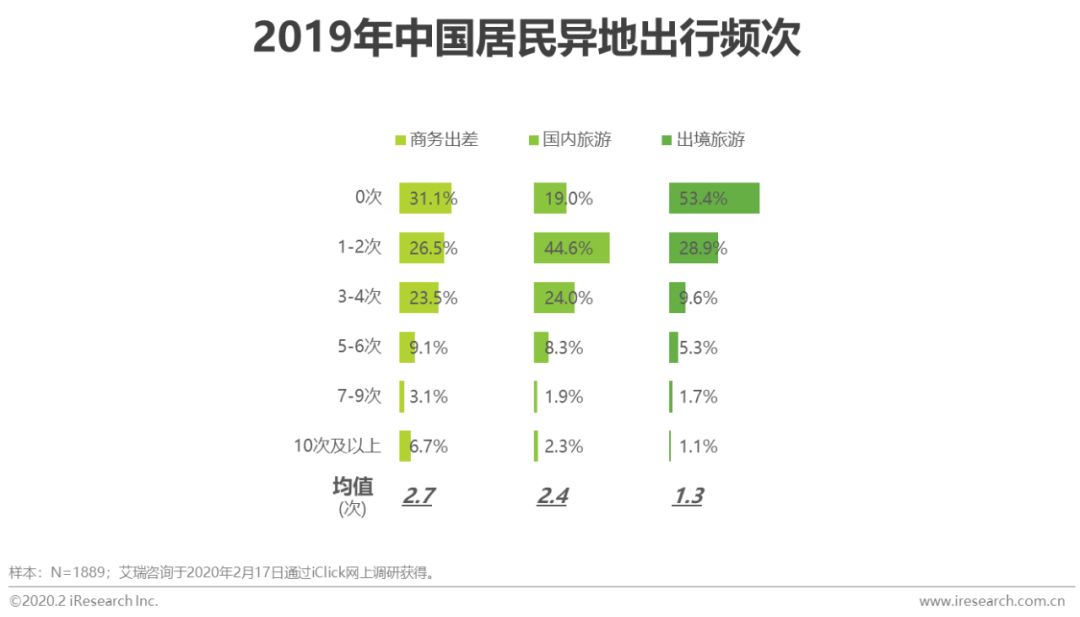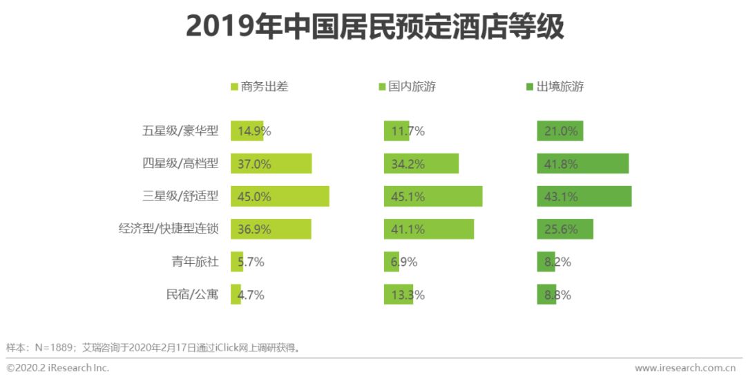 異地出行 疫情加速經(jīng)濟(jì)型及三四星酒店洗牌,低檔次酒店消費(fèi)或?qū)⑸弦?/strong> 2019年,用戶異地出行需求旺盛:68.9%用戶有商務(wù)出差行為,人均出行2.7次;81.0%用戶有國(guó)內(nèi)旅游行為,人均出行2.4次;46.6%用戶有出境旅游行為,人均出行1.3次。 無論是商務(wù)出差、國(guó)內(nèi)旅游還是出境旅游,用戶最愛選擇的都是三四星級(jí)及經(jīng)濟(jì)型酒店。此次疫情使旅游行業(yè)遭受重創(chuàng),酒店消費(fèi)也隨之驟減,經(jīng)濟(jì)型及三四星酒店加速洗牌,眾多消費(fèi)者將面臨品牌的重新選擇。疫情的發(fā)生,使得用戶將更多選擇大型/知名連鎖酒店,檔次相對(duì)較低的酒店消費(fèi)需求或?qū)⑸弦啤?/strong>
