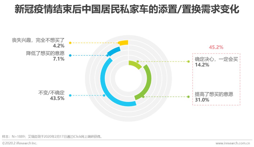 私家車消費(fèi)需求變化 疫情利好用戶私家車消費(fèi)需求,45.2%用戶將推進(jìn)購(gòu)車進(jìn)程 本次疫情不僅促使用戶在日常出行更多選擇了使用私家車,在疫情結(jié)束之后,45.2%用戶的私家車添置/置換需求也有所提升,其中14.2%用戶確定了購(gòu)車決心,31.0%的用戶提高了想買的意愿;這一部分用戶將推進(jìn)購(gòu)車進(jìn)程,決策周期縮短。疫情結(jié)束后,車企需要精準(zhǔn)找到這部分用戶,加強(qiáng)用戶營(yíng)銷及線索收集工作。 僅11.3%用戶出于疫情導(dǎo)致的消費(fèi)心態(tài)變化及經(jīng)濟(jì)狀況變化等原因降低了汽車消費(fèi)需求。