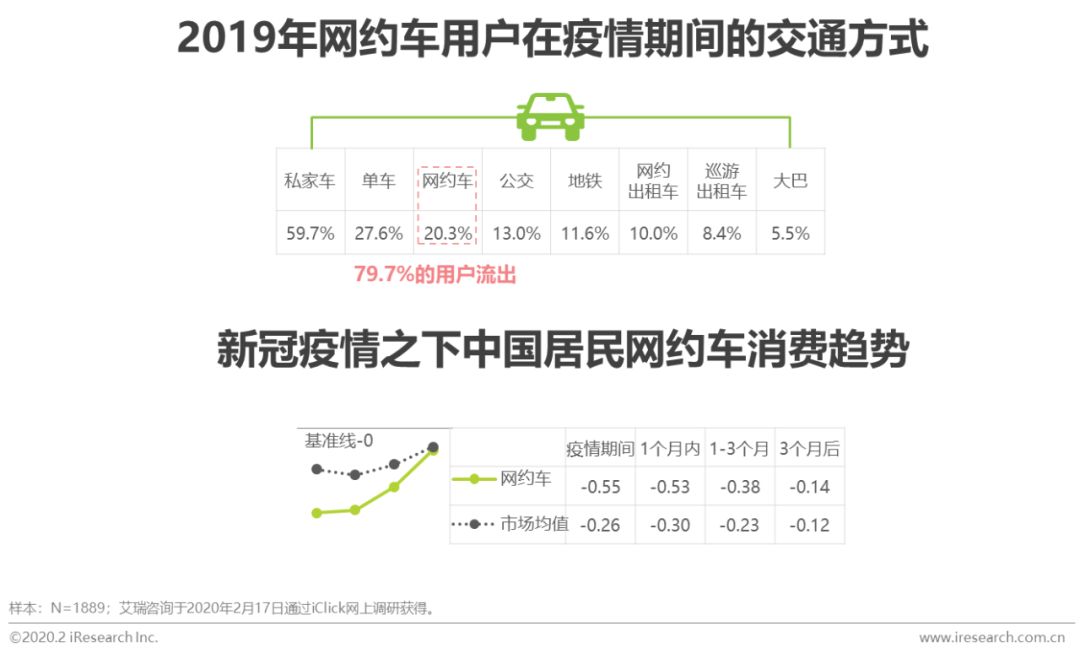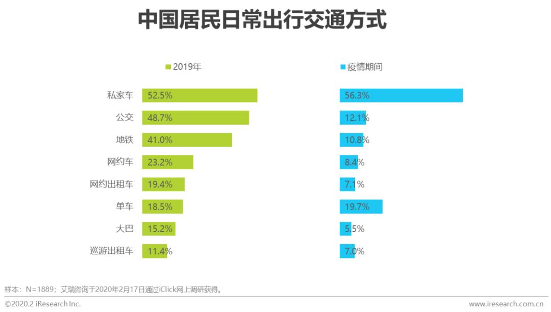 日常出行交通方式 私家車和單車出行略增,網(wǎng)約車用戶流出率近八成 疫情期間居民出行頻次降低,交通工具的使用需求也同步降低;在必要出行時(shí),也多選擇盡量避免與他人接觸的私家車(56.3%)和自行車(19.7%);其他交通方式的使用率均明顯下降,甚至低于單車使用率。 在日常出行會(huì)選擇網(wǎng)約車的用戶中,疫情期間僅20.3%選擇了網(wǎng)約車,用戶流出率近八成。未來一段時(shí)間,網(wǎng)約車仍將保持低于市場(chǎng)整體的發(fā)展趨勢(shì),控制用戶大量流出及應(yīng)對(duì)平臺(tái)之間的用戶重新爭(zhēng)奪將是網(wǎng)約車企業(yè)在未來一段時(shí)間業(yè)務(wù)重點(diǎn)。