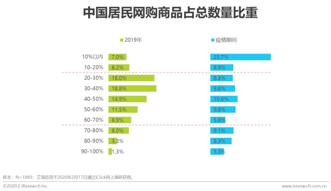 疫情期間商品消費(fèi)變化 線上線下購(gòu)物雙下滑,網(wǎng)購(gòu)商品數(shù)量占比向兩級(jí)轉(zhuǎn)移 疫情期間,用戶線上線下購(gòu)物雙雙下滑,對(duì)比2019年,網(wǎng)購(gòu)消費(fèi)指數(shù)為-0.22,線下購(gòu)物消費(fèi)指數(shù)為-0.40。 從網(wǎng)購(gòu)商品數(shù)量占比來看,一部分用戶選擇盡量不網(wǎng)購(gòu),占比20%以下的用戶比例上升,尤其占比10%以內(nèi)的用戶比例大幅上漲;另一部分用戶選擇將線下購(gòu)物需求轉(zhuǎn)移到線上,占比70%以上的用戶比例上升。 未來一段時(shí)間網(wǎng)購(gòu)的消費(fèi)趨勢(shì)將持續(xù)高于市場(chǎng)整體,對(duì)于輕度用戶的喚醒和重度用戶的維系和重新爭(zhēng)奪是未來一段時(shí)間網(wǎng)購(gòu)行業(yè)的關(guān)注重點(diǎn)。