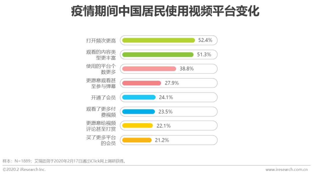 在線視頻 用戶粘性提高,但如何保持是運(yùn)營(yíng)難題 2019年,用戶花費(fèi)了大量時(shí)間觀看視頻內(nèi)容——日均觀看長(zhǎng)視頻65.6分鐘,觀看短視頻53.6分鐘。 疫情期間,用戶的視頻觀看行為更加積極,使用粘性提高——打開頻次更高且觀看類型更豐富;此外,用戶的付費(fèi)行為也有增長(zhǎng)。但另一方面,用戶使用的平臺(tái)個(gè)數(shù)變多,且在疫情之后消費(fèi)趨勢(shì)將會(huì)回落,如何留住新用戶和保持用戶高粘性是視頻平臺(tái)面臨的運(yùn)營(yíng)挑戰(zhàn)。