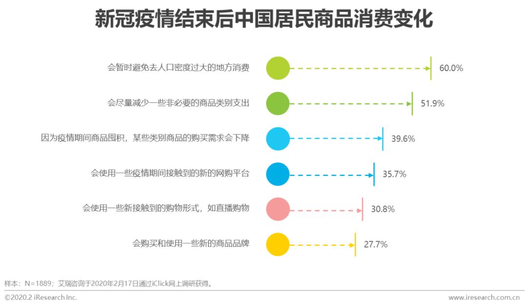 疫情結(jié)束后商品消費(fèi)變化 避開人流和壓縮支出是疫情結(jié)束后一段時(shí)間的消費(fèi)主旋律 疫情結(jié)束之后,六成用戶會(huì)暫時(shí)避免去人口密度過大的地方消費(fèi),線下流量減少,實(shí)體業(yè)態(tài)面臨考驗(yàn)的同時(shí)也是電商的機(jī)會(huì)點(diǎn);并且,部分用戶將進(jìn)行網(wǎng)購(gòu)平臺(tái)/購(gòu)物形式/商品品牌的嘗新,電商行業(yè)或有新氣象。 此外,出于壓縮支出和商品囤積的原因,未來一段時(shí)間的用戶消費(fèi)需求將會(huì)下降,各購(gòu)物渠道、各渠道內(nèi)平臺(tái)、各品牌的競(jìng)爭(zhēng)都將加劇。
