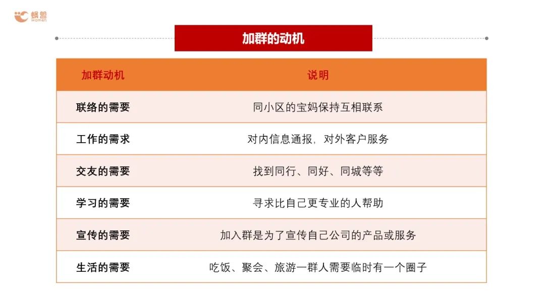 需要找到加群的人的屬性,也就是為什么加群,社群是為了滿足溝通的,傳播,社交的需求。 疫情期間,社區(qū)電商是剛需,而當(dāng)疫情過去,滿足生活剛需不再只有社群,需要考慮的是疫情過去依然保持社群的活躍度,所以,在疫情期間不要只考慮訂貨、送貨,同樣需要建立起一整套社群打法。
