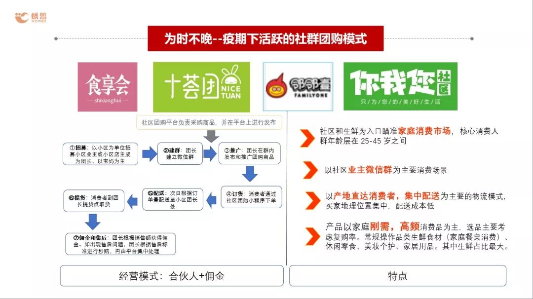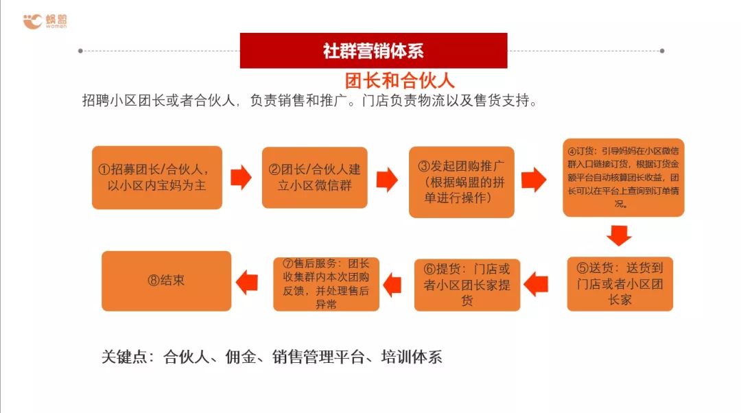 那么社區(qū)電商是如何操作團(tuán)長/合伙人的呢?以寶媽為主,協(xié)助團(tuán)長/合伙人建立小區(qū)的微信群,發(fā)起團(tuán)購?fù)茝V,這些活動(dòng)蝸盟都是支持的。分傭機(jī)制極大地鼓勵(lì)了傳播度。