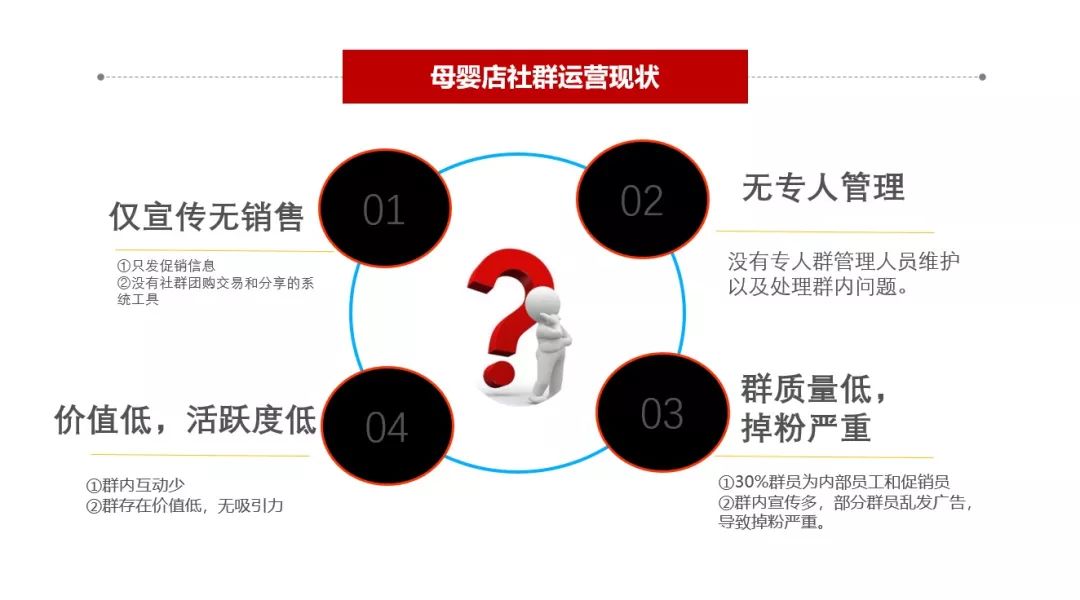 可是看大多數(shù)母嬰門店的社群,(疫期除外)社群大多數(shù)是沒有經(jīng)營起來的,只發(fā)促銷信息,沒有社群團(tuán)購交易和分享的系統(tǒng)工具,維護(hù)上,基本是老板娘或者是店長在維護(hù),群里面的角色也比單一,就店長天天活躍,其他人都不活躍,客戶在里面沒有獲得價(jià)值,群漸漸沉寂,長此以往,形成惡性循環(huán)。