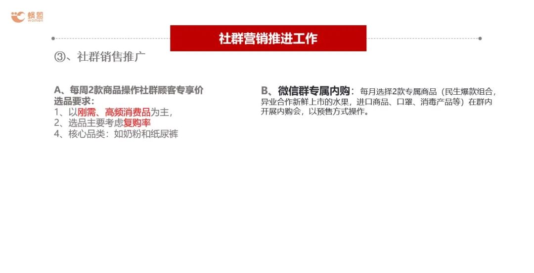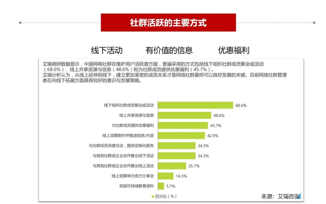 在社群中需要做銷售推廣時(shí),建議將產(chǎn)品分為兩大類:一是門店相關(guān)的產(chǎn)品,享受專享價(jià),選品以高頻剛需或低價(jià)為主,主要考慮復(fù)購率。社群營銷中容易爆火的反而是線下門店不常賣的產(chǎn)品,打造本地化生態(tài)圈,可以進(jìn)行異業(yè)合作,幫異業(yè)門店承擔(dān)團(tuán)購之類的活動(dòng),可有效的活躍和豐富社群,劃重點(diǎn)!做鮮活的社群!采用不同的活動(dòng)玩法,不同的產(chǎn)品形式等等來打造鮮活的社群。以下是常見的活躍社群的方式: 1. 線下組織一些活動(dòng),例如:西瓜采摘群,草莓采摘群,跨年分享群 2. 承載一些共享資源,例如:異業(yè)優(yōu)惠券 3. 聯(lián)合品牌廠家的福利政策,例如:篩選出群活躍前10名享受一元購活動(dòng)等等。
