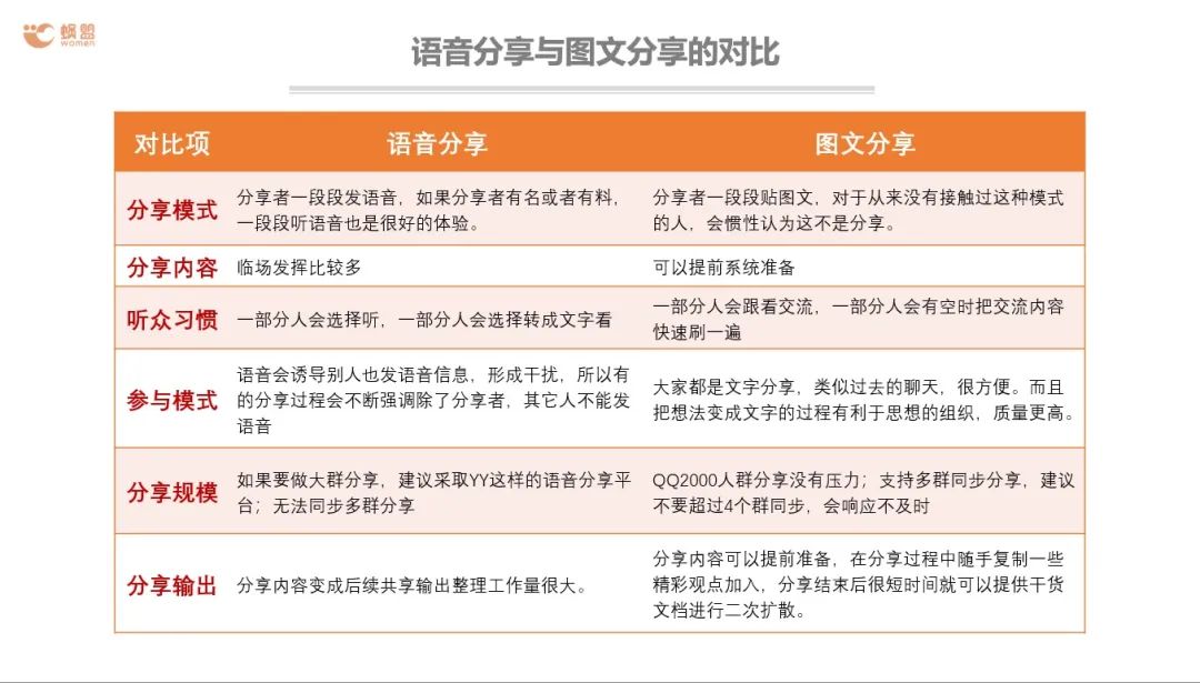 那么干貨分享如何讓落地呢?可分為語音分享/圖文分享。 語音分享親和力很強(qiáng),能感受到分享者的情緒,也分具有人情味兒,弊端是很容易被打散且聽起來不太方便;圖文分享便是閱讀效率高,方便匯總,但欠缺人情味兒。具體實(shí)施方式可自行選擇合適的。 課程分享總結(jié) 1. 現(xiàn)在開始做社群晚不晚? 不晚,也希望大家不要沉迷于現(xiàn)在社群的虛假繁榮狀態(tài),時(shí)時(shí)刻刻警惕疫情過后需要打響的持久戰(zhàn)。 2.做好社群管理需要基于做好社區(qū)的社交屬性,拼團(tuán)便是核心工具,一定要熟練運(yùn)用可帶來爆發(fā)式增量,參考拼多多。 3.社群日;钴S的方式:需要建立社群的基本群規(guī)和管理角色的分配 4.通過各類活動(dòng)提高社群活躍度