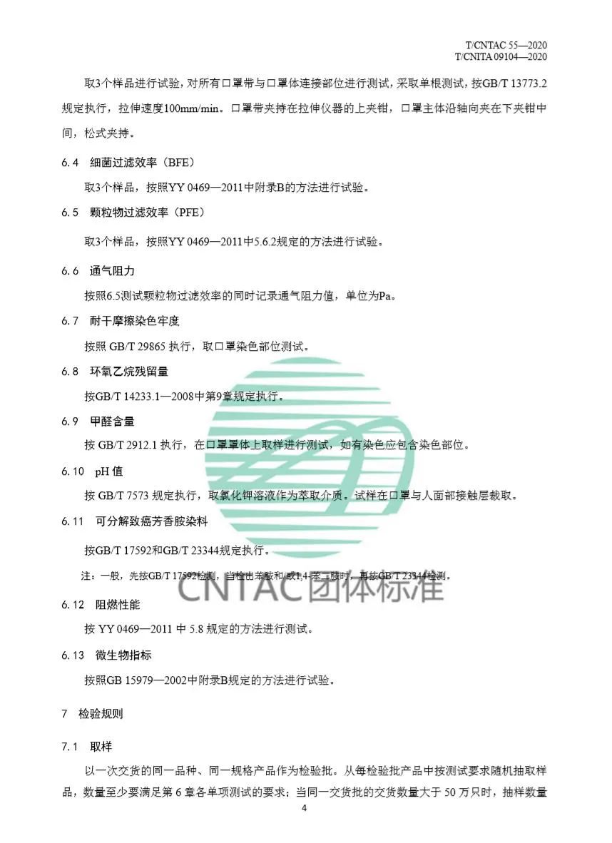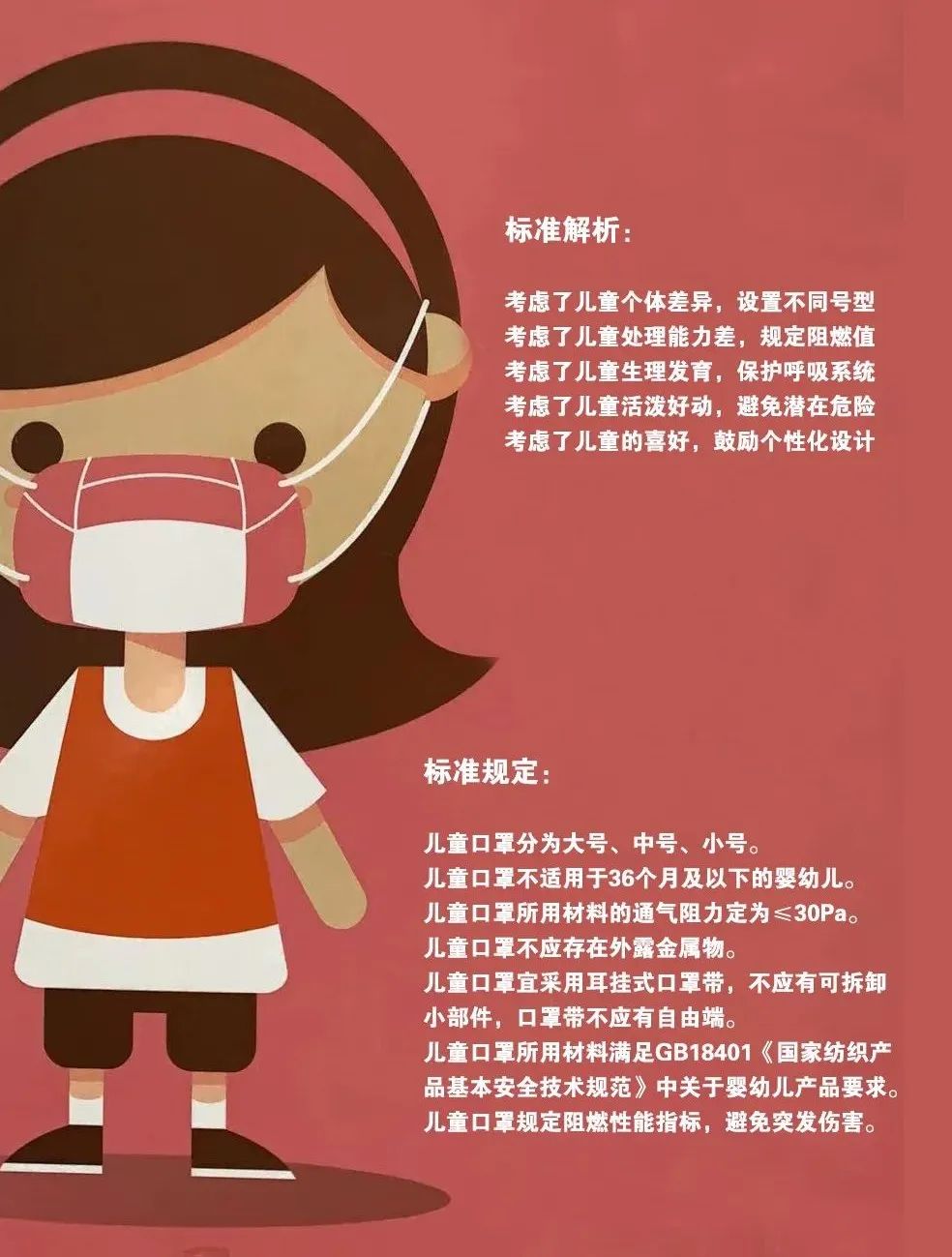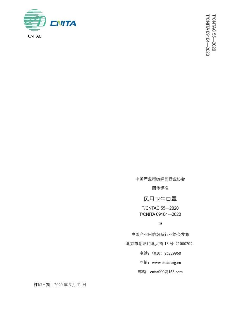 為什么要做《民用衛(wèi)生口罩》? 疫情期間,口罩需求急劇增加,出現(xiàn)了民用口罩企業(yè)采標(biāo)亂、市場(chǎng)監(jiān)管難、消費(fèi)者無(wú)從辨別等一系列新問(wèn)題。 目前國(guó)家相關(guān)口罩標(biāo)準(zhǔn)中沒(méi)有對(duì)兒童口罩進(jìn)行專門(mén)規(guī)定,疫情期間兒童應(yīng)該選用什么樣的口罩,也成為社會(huì)焦點(diǎn)所在! 現(xiàn)有口罩標(biāo)準(zhǔn) 民用防護(hù)型口罩標(biāo)準(zhǔn):GB/T 32610—2016 《日常防護(hù)型口罩技術(shù)規(guī)范》,GB 2626—2006《呼吸防護(hù)用品自吸過(guò)濾式防顆粒物呼吸器》,主要適用于顆粒物防護(hù),在本次疫情中發(fā)揮了重要作用,但是復(fù)工復(fù)產(chǎn)中大量使用了阻隔型口罩(平面型口罩為主),無(wú)法滿足上述兩個(gè)標(biāo)準(zhǔn)要求。 醫(yī)用領(lǐng)域標(biāo)準(zhǔn):GB 19083—2010《醫(yī)用防護(hù)口罩技術(shù)要求》、YY 0469—2011《醫(yī)用外科口罩》、YY/T 0969—2013《一次性使用醫(yī)用口罩》,主要適用于醫(yī)療領(lǐng)域。 《民用衛(wèi)生口罩》制定過(guò)程 1、立項(xiàng)準(zhǔn)備階段 口罩需求量上漲,標(biāo)準(zhǔn)遇到新問(wèn)題。 為滿足疫情緊急情況下民眾對(duì)口罩的需求、轉(zhuǎn)產(chǎn)口罩企業(yè)的采標(biāo),保證產(chǎn)品質(zhì)量和市場(chǎng)監(jiān)管,中國(guó)產(chǎn)業(yè)用紡織品行業(yè)協(xié)會(huì)提出立項(xiàng)申請(qǐng),快速起草《衛(wèi)生用口罩》團(tuán)體標(biāo)準(zhǔn)。 2、標(biāo)準(zhǔn)起草階段 2月25日編制計(jì)劃下達(dá)。中國(guó)產(chǎn)業(yè)用紡織品協(xié)會(huì)成立標(biāo)準(zhǔn)起草小組,在前期行業(yè)調(diào)研的基礎(chǔ)上,對(duì)標(biāo)分析、重點(diǎn)討論,確定框架,編制標(biāo)準(zhǔn),并根據(jù)標(biāo)準(zhǔn)適用性將標(biāo)準(zhǔn)名稱變更為《民用衛(wèi)生口罩》。 2月28日完成標(biāo)準(zhǔn)征求意見(jiàn)稿。 3、征求意見(jiàn)階段 3月4日,標(biāo)準(zhǔn)完成征求意見(jiàn)稿的社會(huì)意見(jiàn)征求,共收到意見(jiàn)103 條,其中采納34 條,部分采納23 條。起草組進(jìn)一步完善標(biāo)準(zhǔn),形成送審稿和編制說(shuō)明。 4、標(biāo)準(zhǔn)報(bào)批階段 中紡聯(lián)和中產(chǎn)協(xié)標(biāo)委會(huì)分別對(duì)標(biāo)準(zhǔn)送審稿進(jìn)行函審,起草組根據(jù)函審意見(jiàn),再次完善標(biāo)準(zhǔn)文本和編制說(shuō)明,形成報(bào)批稿。 5、標(biāo)準(zhǔn)發(fā)布 3月11日,T/CNTAC 55—2020、T/CNITA 09104—2020《民用衛(wèi)生口罩》標(biāo)準(zhǔn)發(fā)布。 《民用衛(wèi)生口罩》使用場(chǎng)景 本標(biāo)準(zhǔn)適用于日常環(huán)境中普通人群用于阻隔飛沫、花粉、微生物等顆粒物傳播的民用衛(wèi)生口罩。 本標(biāo)準(zhǔn)圍繞口罩應(yīng)具備的功能及佩戴安全性設(shè)定指標(biāo),主要包括材料及佩戴安全性、必要的阻隔功能,并且特別關(guān)注佩戴舒適性。 《民用衛(wèi)生口罩》的主要內(nèi)容 13項(xiàng)標(biāo)準(zhǔn)指標(biāo)為口罩性能保駕護(hù)航: 適合復(fù)工復(fù)學(xué)佩戴,可有效阻隔飛沫、花粉、微生物等顆粒物傳播; 分為成人口罩和兒童口罩,規(guī)格分別為大號(hào)(L)中號(hào)(M)小號(hào)(S); 明確佩戴的安全性和材料,不應(yīng)存在可觸及的銳利尖端和銳利邊緣,兒童用口罩宜采用耳掛式口罩帶,不應(yīng)有可拆卸小部件等,兒童口罩帶不應(yīng)有自由端,口罩原材料不應(yīng)使用再生料,口罩與皮膚直接接觸材料不得染色等; 突出口罩阻隔功能,細(xì)菌過(guò)濾效率不低于95%,顆粒物過(guò)濾效率不低于90%; 突出口罩佩戴舒適性,成人用口罩通氣阻力定為≤49Pa,兒童用口罩通氣阻力定為≤30Pa; 并且明確規(guī)定了環(huán)氧乙烷殘留量、耐干摩擦色牢度、甲醛含量、pH值、可分解致癌芳香胺染料、微生物指標(biāo)、阻燃性能等指標(biāo); 兒童口罩有要求: