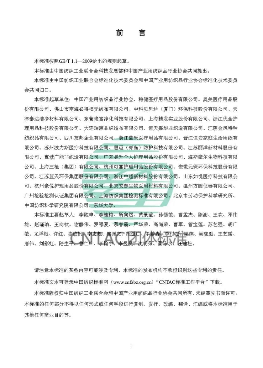 《民用衛(wèi)生口罩》的編制團(tuán)隊(duì) 起草單位涵蓋口罩研發(fā)、生產(chǎn)、材料、檢測(cè)、管理全產(chǎn)業(yè)鏈。專家團(tuán)隊(duì)來(lái)自行業(yè)協(xié)會(huì)、口罩生產(chǎn)企業(yè)、材料生產(chǎn)企業(yè)、醫(yī)療器械使用單位、科研院所及檢測(cè)單位。 起草單位名單:中國(guó)產(chǎn)業(yè)用紡織品行業(yè)協(xié)會(huì)、穩(wěn)健醫(yī)療用品股份有限公司、奧美醫(yī)療用品股份有限公司、佛山市南海必得福無(wú)紡布有限公司、中科貝思達(dá)(廈門(mén))環(huán)保科技股份有限公司、天津泰達(dá)潔凈材料有限公司、東營(yíng)俊富凈化科技有限公司、上海精發(fā)實(shí)業(yè)股份有限公司、浙江優(yōu)全護(hù)理用品科技股份有限公司、大連瑞源非織造布有限公司、恒天嘉華非織造有限公司、江陰金鳳特種紡織品有限公司、四川友邦企業(yè)有限公司、浙江藍(lán)禾醫(yī)療用品有限公司、晉江恒安家庭生活用紙有限公司、蘇州波力斯醫(yī)療科技有限公司、思邁(青島)防護(hù)科技有限公司、江蘇麗洋新材料股份有限公司、宣城廣能非織造有限公司、廣東昱升個(gè)人護(hù)理用品股份有限公司、海斯摩爾生物科技有限公司、上海三槍(集團(tuán))有限公司、杭州可靠護(hù)理用品股份有限公司、安徽元琛環(huán)保科技股份有限公司、江蘇藍(lán)天環(huán)保集團(tuán)股份有限公司、浙江中超新材料股份有限公司、山東如悅醫(yī)療科技有限公司、杭州豪悅護(hù)理用品股份有限公司、北京安泰生物醫(yī)用材料有限公司、溫州方圓儀器有限公司、廣州檢驗(yàn)檢測(cè)認(rèn)證集團(tuán)有限公司、上海紡織集團(tuán)檢測(cè)標(biāo)準(zhǔn)有限公司、北京市勞動(dòng)保護(hù)科學(xué)研究所、中國(guó)紡織科學(xué)研究院有限公司、東華大學(xué) 標(biāo)準(zhǔn)文本如下: