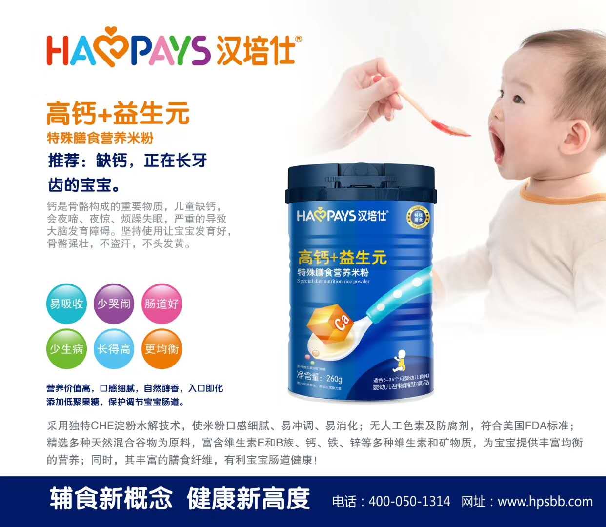 此次,重磅推出的新品漢培仕特殊膳食營(yíng)養(yǎng)米粉更是沿襲了漢培仕以往的風(fēng)格,從優(yōu)選原材料入手,嚴(yán)把質(zhì)量關(guān),確保產(chǎn)品的質(zhì)量安全,同時(shí),在輔食的基礎(chǔ)上,特別采用獨(dú)特特膳配方,添加了低聚果糖、維生素C等多種營(yíng)養(yǎng)成分,呵護(hù)腸道健康,促進(jìn)鐵的吸收,它不僅僅是一款輔食,更是一款調(diào)理型的營(yíng)養(yǎng)品。 漢培仕特殊膳食營(yíng)養(yǎng)米粉系列有高鈣+高鐵、高鐵+益生菌、高鋅+乳酸菌三大配方單品,根據(jù)成長(zhǎng)需求添加多種營(yíng)養(yǎng)元素,如鈣、鐵、鋅、多種維生素及礦物質(zhì)等等,配比科學(xué),口感純正,營(yíng)養(yǎng)均衡。采用精美罐裝,食用方便,干凈衛(wèi)生。