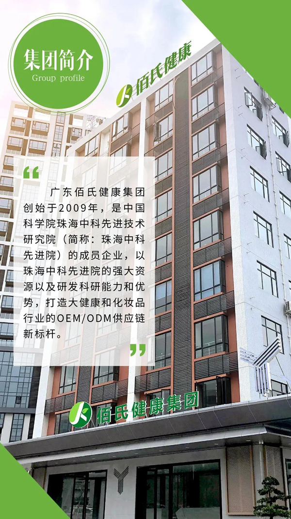 佰氏健康集團簡介 廣東佰氏健康集團創(chuàng)始于2009年,是中國科學院珠海中科先進技術(shù)研究院(簡稱:珠海中科先進院)的成員企業(yè),以珠海中科先進院的強大資源以及研發(fā)科研能力和優(yōu)勢,打造大健康和化妝品行業(yè)的0EM/ODM供應(yīng)鏈新標桿。