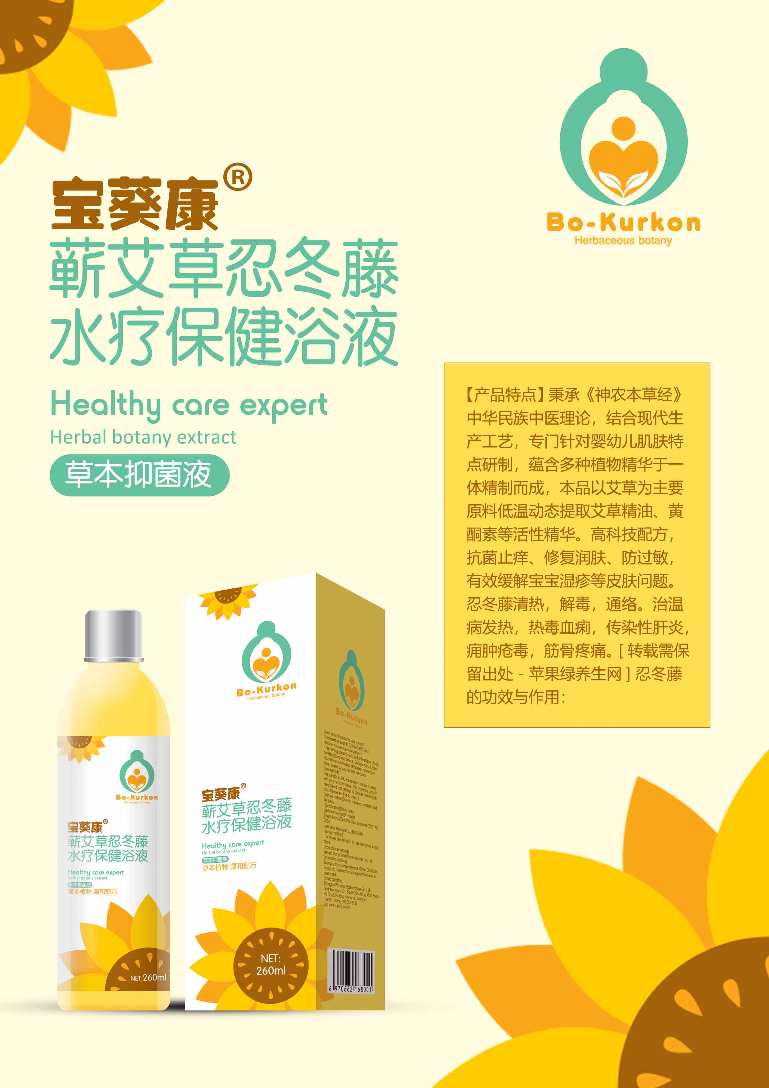 富含黃芪、野菊花等植物精華成分,有殺菌解毒、瀉火涼血、清熱燥濕、健胃安脾等作用。 寶葵康金銀花菖蒲水療保健浴液