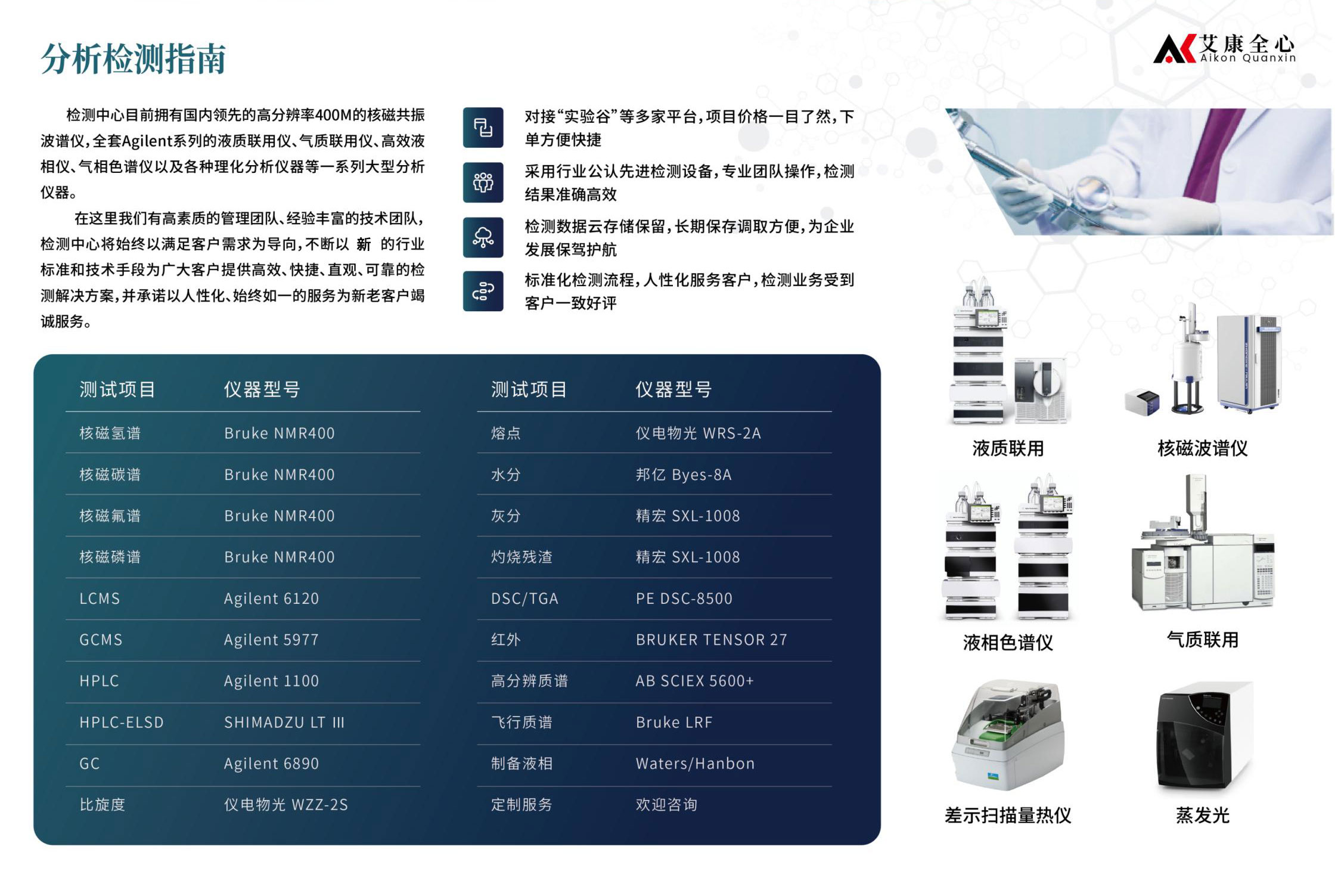 艾康全心分析檢測中心配備了國內(nèi)的高分辨率400M核磁共振波譜儀,以及全套Agilent系列的分析儀器,包括但不限于液質(zhì)聯(lián)用儀、氣質(zhì)聯(lián)用儀、高效液相儀、氣相色譜儀等。這些設(shè)備的引入,為我們的檢測服務(wù)提供了強(qiáng)大的技術(shù)支撐,確保了檢測結(jié)果的無誤。
