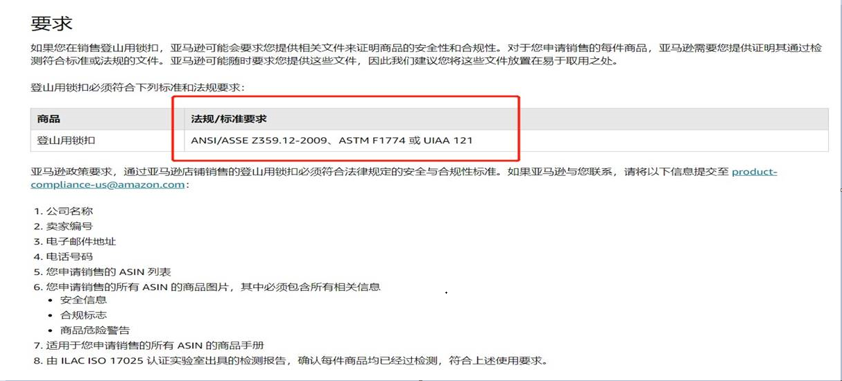 | 登山扣上亞馬遜的檢測認(rèn)證標(biāo)準(zhǔn) | |||